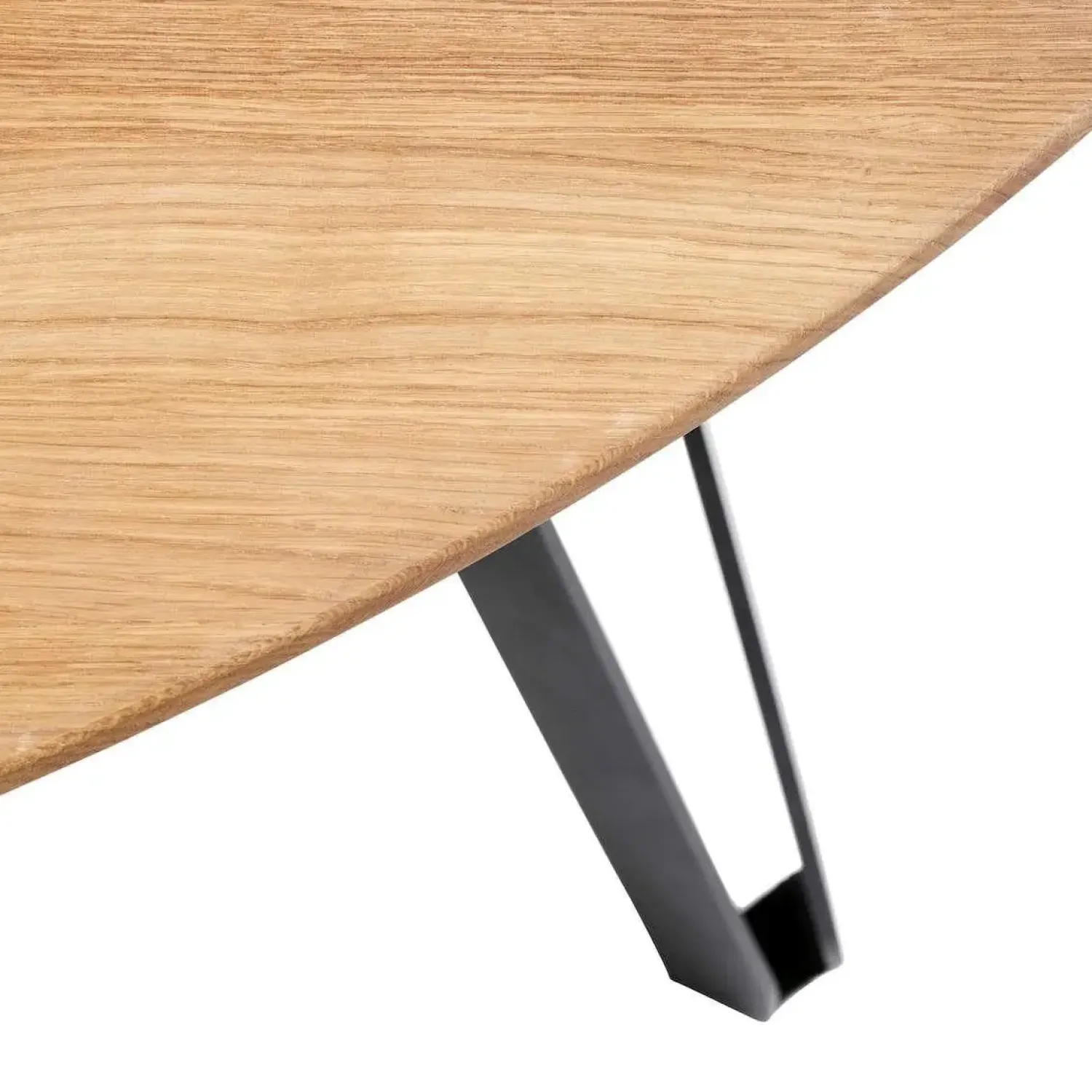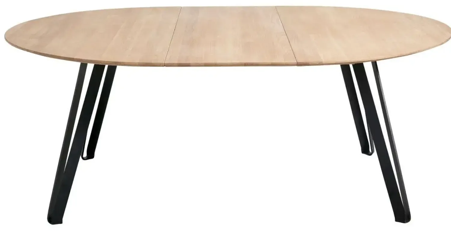 Space spisebordet tilbyder en praktisk løsning til forskellige behov. Den runde form giver mulighed for nem samtale mellem gæsterne, mens den valgfri tillægsplade gør det muligt at udvide bordet efter behov. De sorte, vinklede metalben giver stabil støtte og komplementerer det naturlige egetræ.