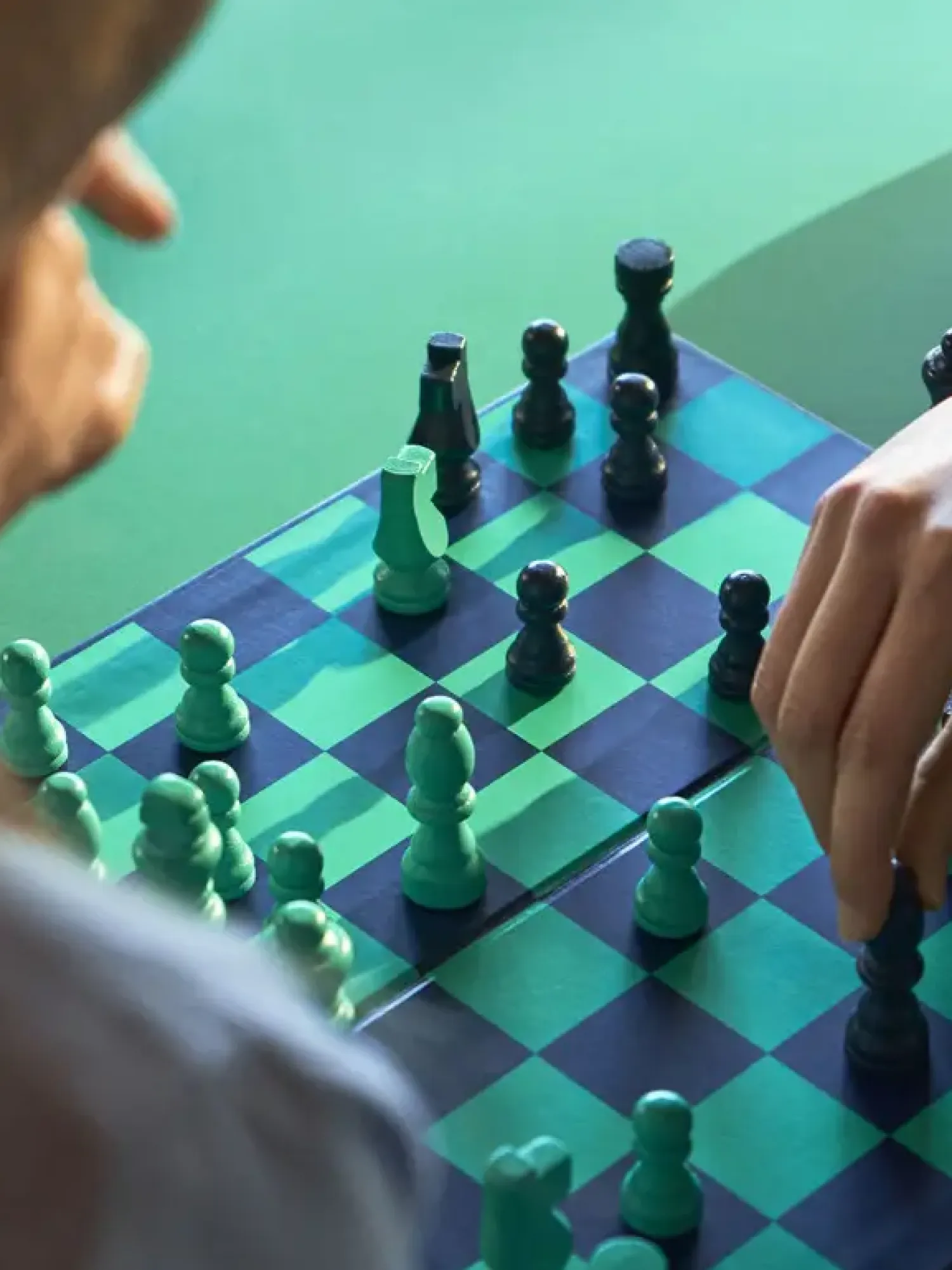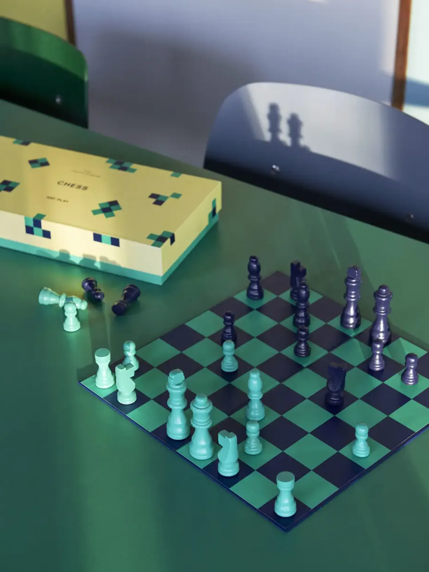 Skakbrættet har en gennemtænkt konstruktion med blå og grønne felter, der giver god kontrast under spillet. De lysegrønne og mørkeblå brikker er nemme at skelne fra hinanden, hvilket gør hver træk tydelig og præcis.