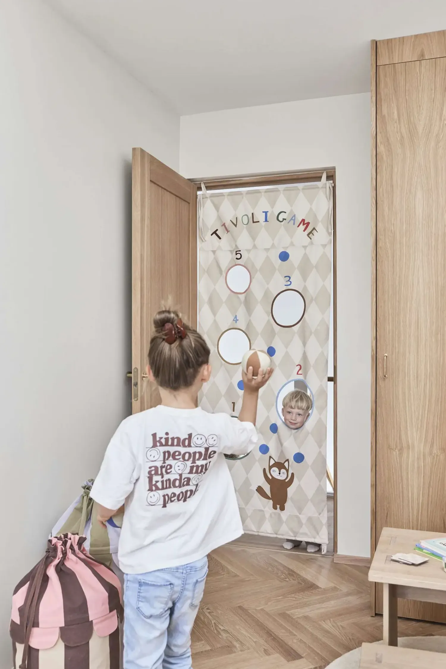 Du får et komplet sæt med bindebånd, der gør monteringen enkel og sikker. Med en dybde på kun 0,5 cm sidder spillet tæt på døren og forstyrrer ikke den daglige færden, mens det stadig er klar til leg når som helst.