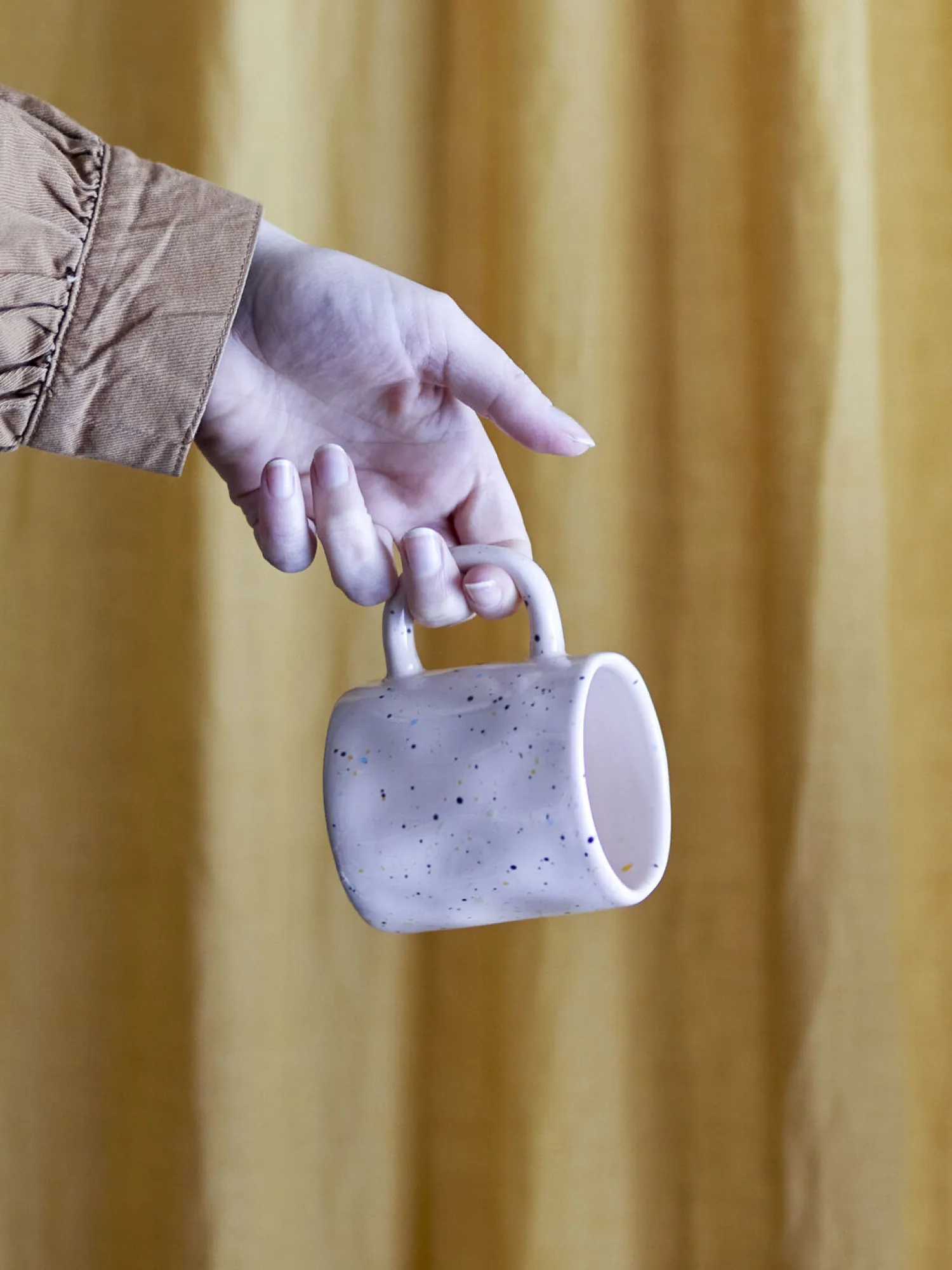 Denne stentøjskop fra Bloomingville har en kapacitet på 210 ml og måler 7,5 cm i diameter og 8 cm i højden. Den rosa kop prydes af et karakteristisk spættet design i sorte, gule og blå nuancer.