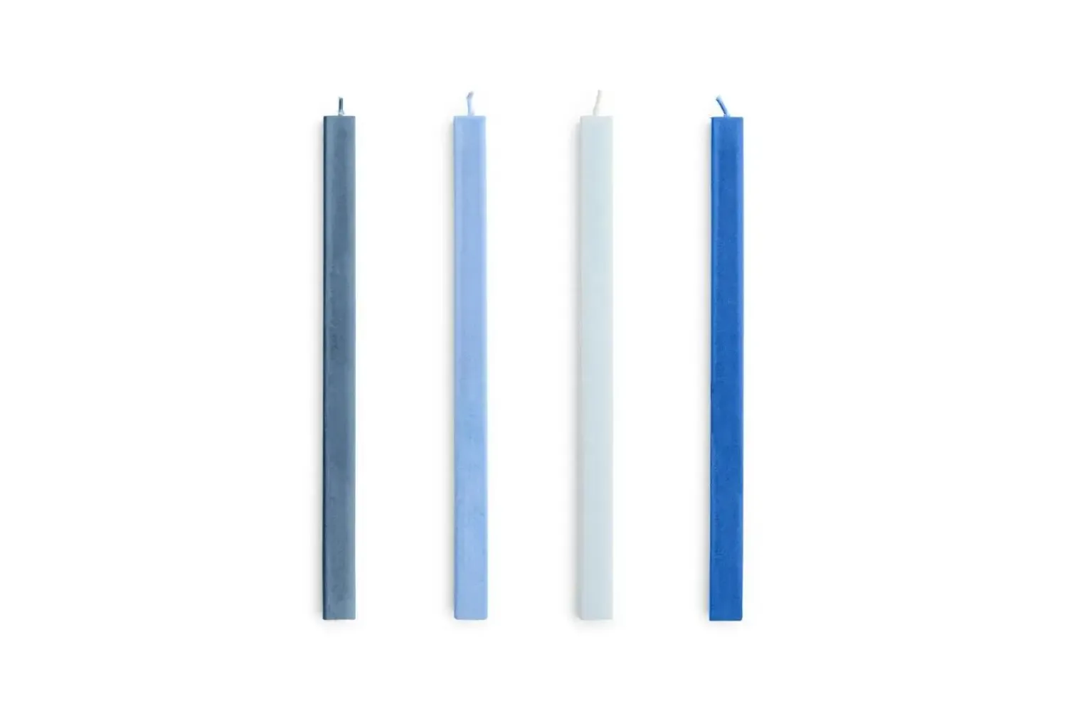 Fire kvadratiske stearinlys i forskellige blå nuancer, der skaber en rolig stemning i dit hjem. Lysene er fremstillet af 100 % stearin, hvilket sikrer en længere og renere brændetid end traditionelle paraffinlys.