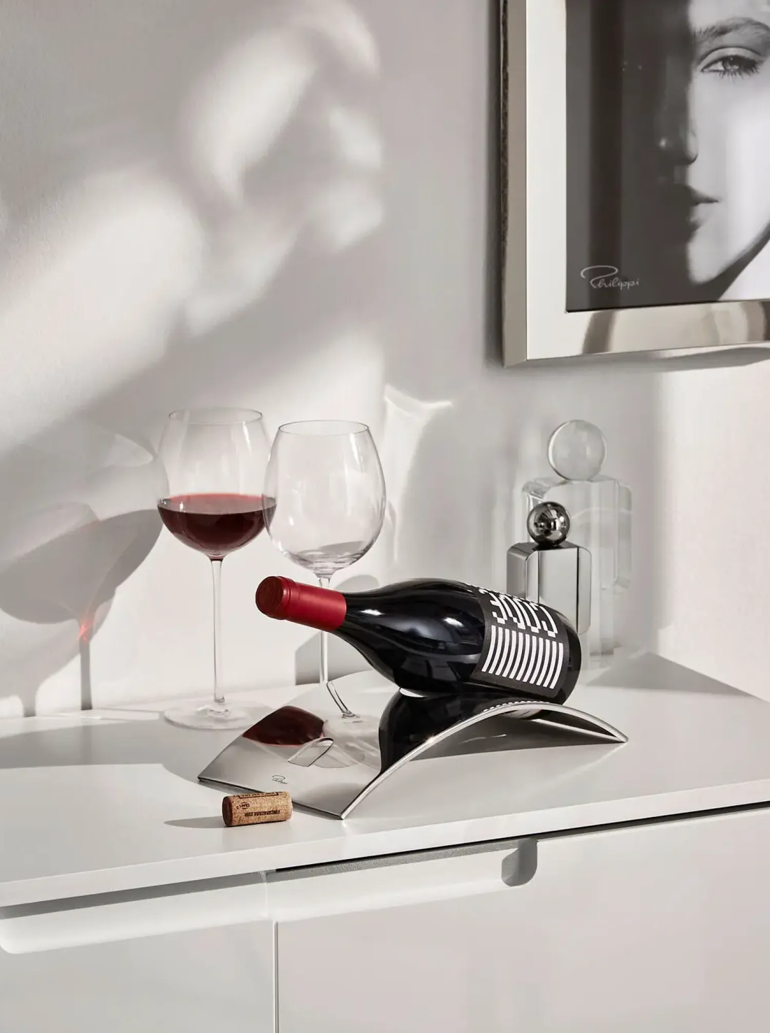 Philippi – Stand vinflaskeholder er et praktisk tilbehør til din næste middag eller hyggeaften. Dette design fremviser din vin på en stilfuld måde, der passer til forskellige bordopdækninger.