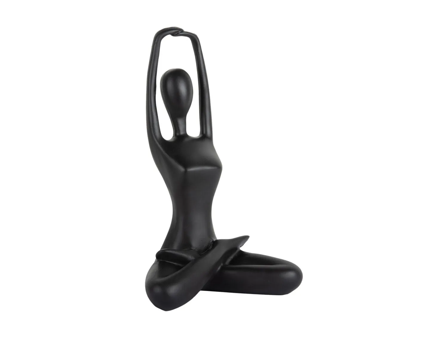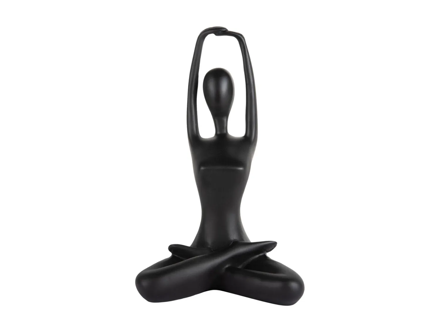 Figuren sidder i lotusposition med armene strakt opad, hvilket skaber en meditativ atmosfære. Hvis du værdsætter mindfulness og søger at skabe harmoniske omgivelser, kan denne statue fungere som et roligt fokuspunkt. Den sorte overflade og det minimalistiske udtryk understøtter en æstetik, der fremmer introspektion og balance.
