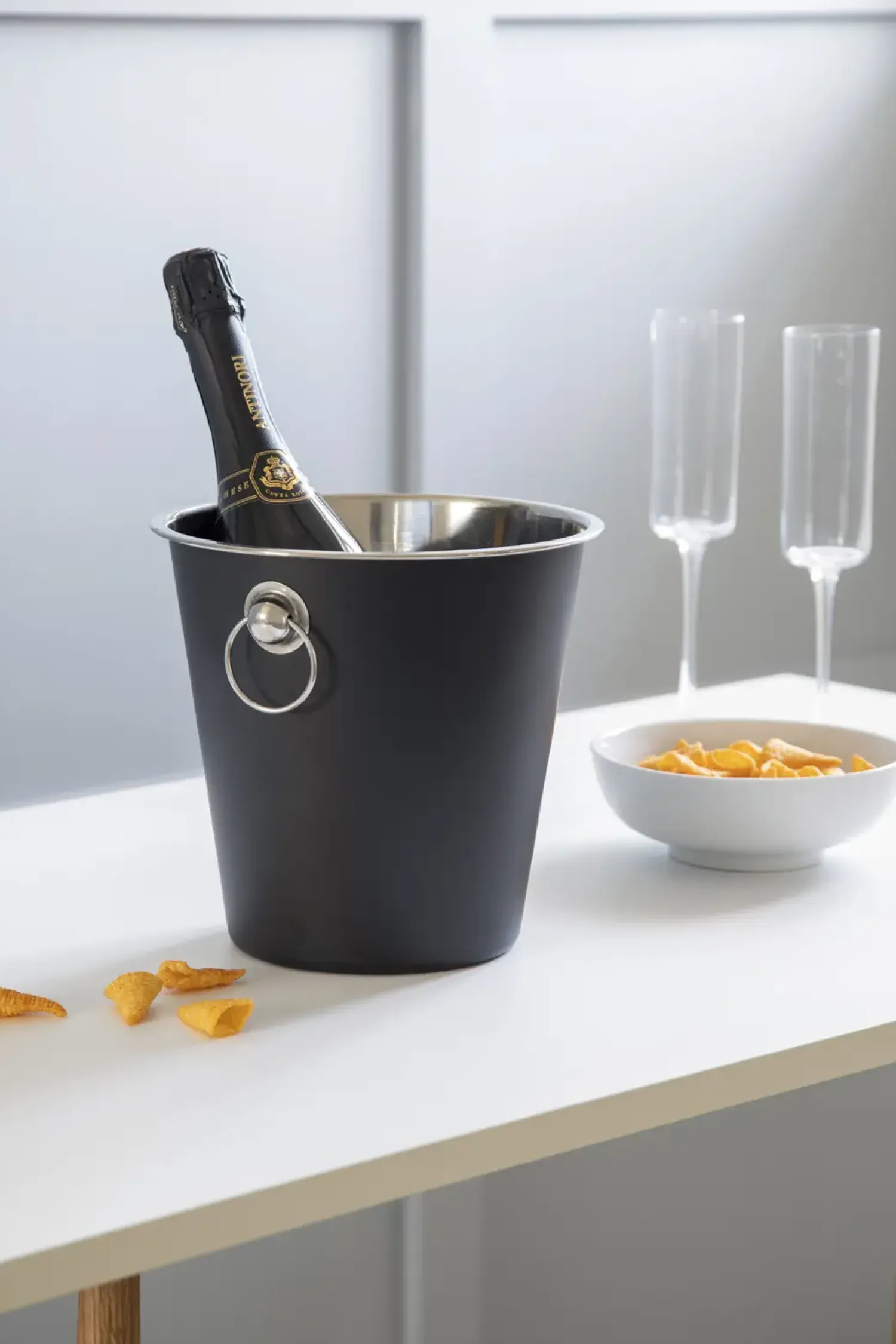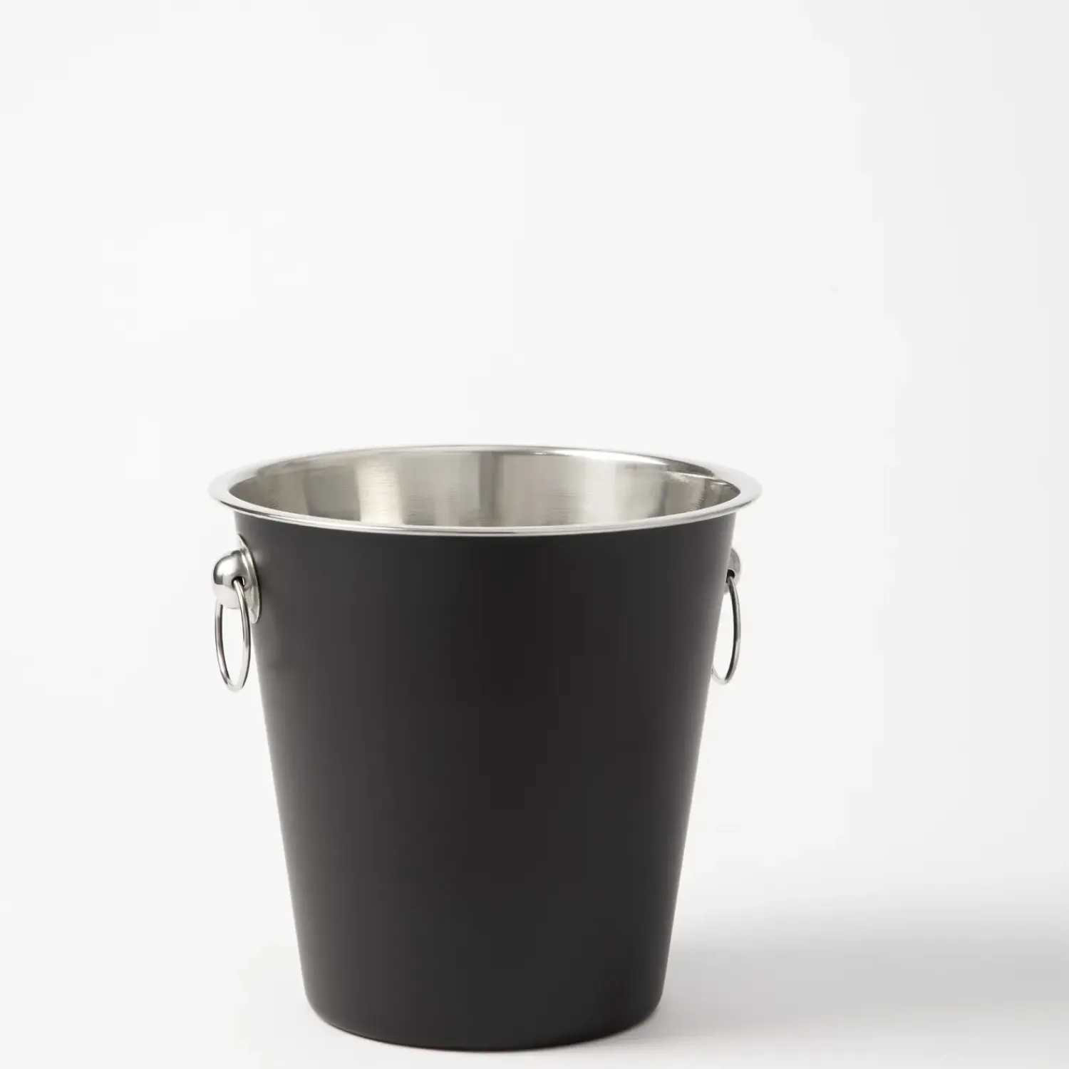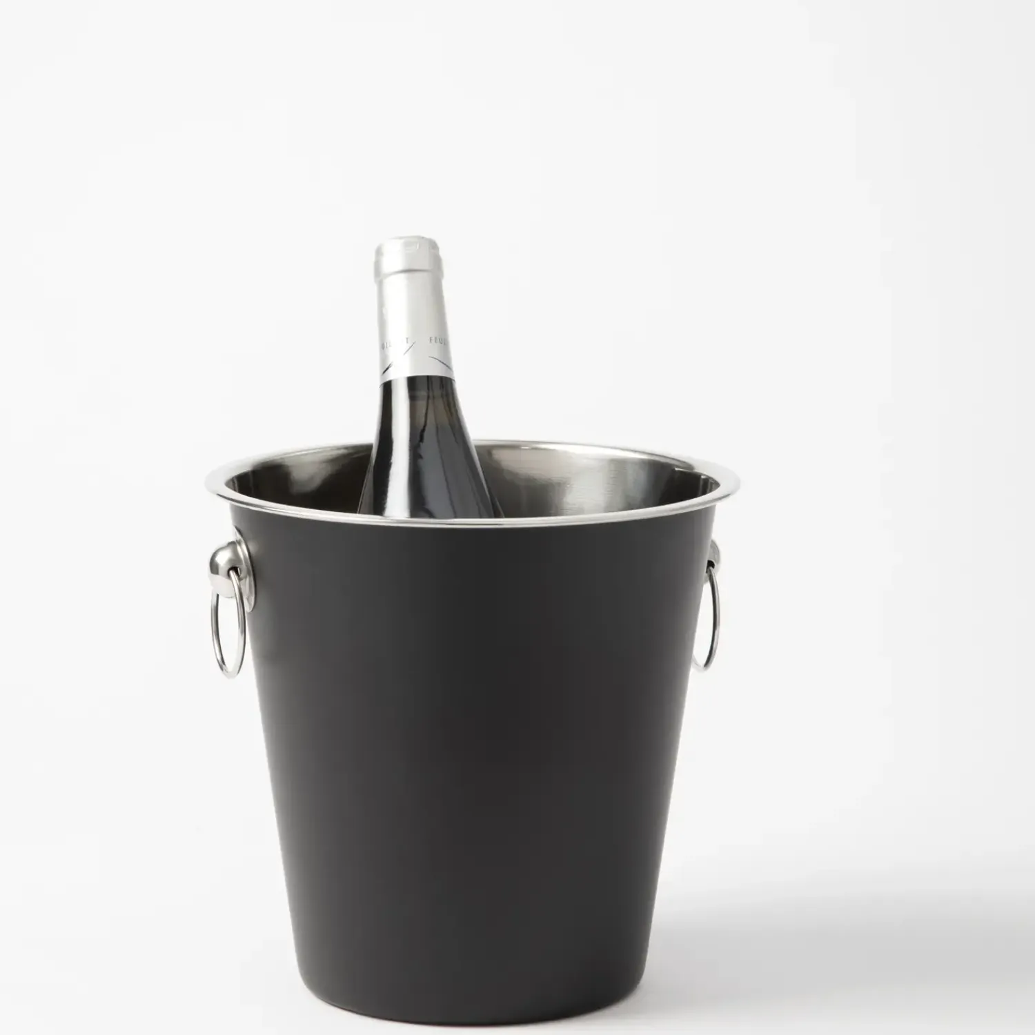 Denne champagnespand i rustfrit stål holder effektivt din vin og champagne kølig. Den matte sorte finish kombinerer holdbarhed med et tidløst udtryk, mens de to ringformede håndtag sikrer nem håndtering, selv når spanden er fyldt.