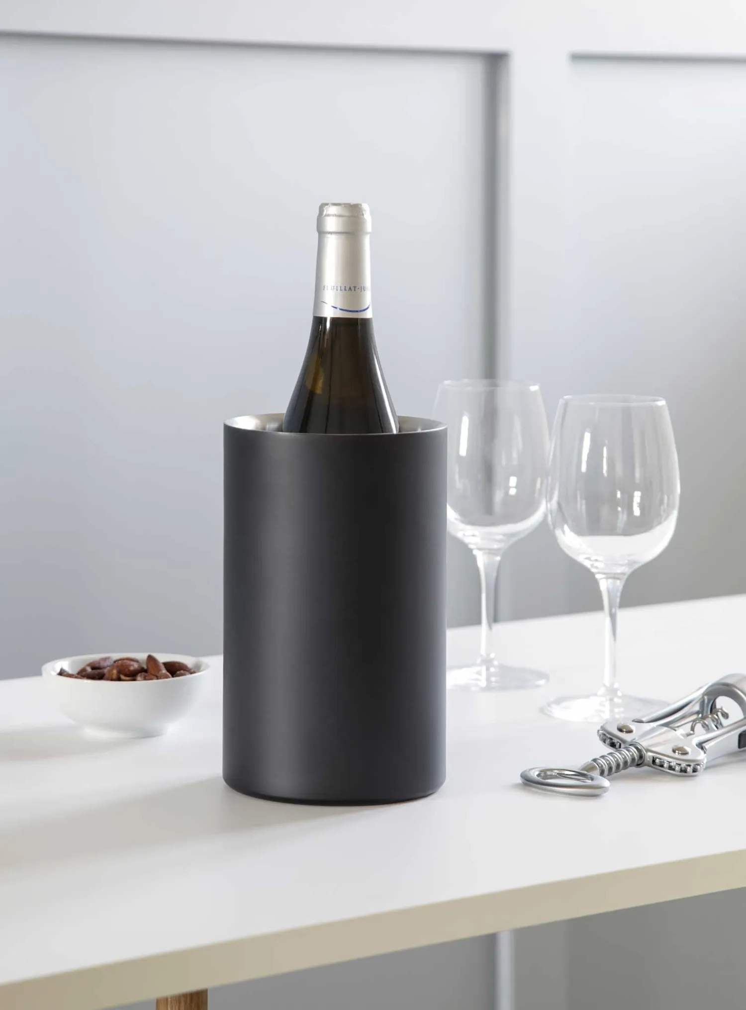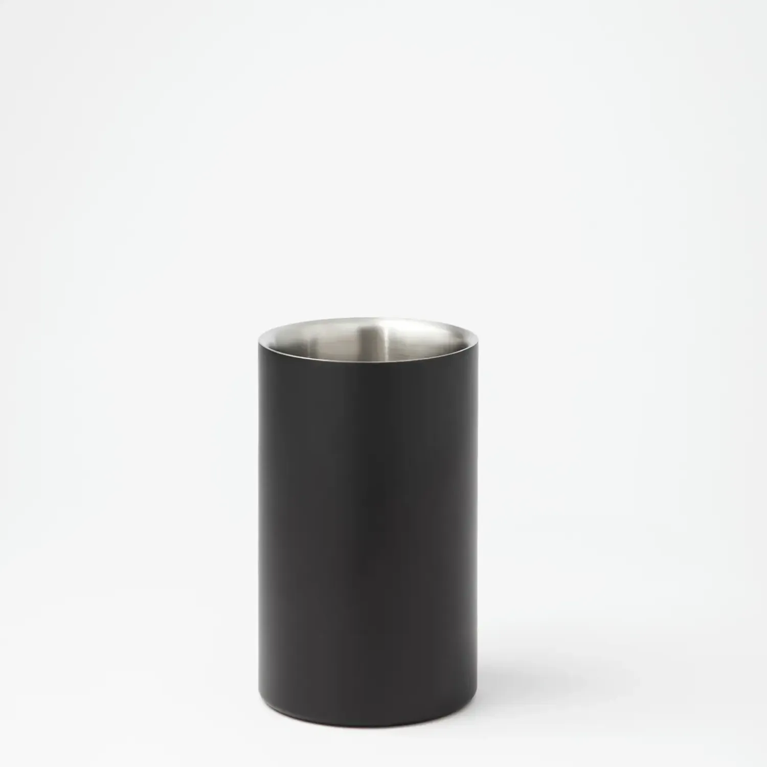 Den matte sorte overflade giver vinkøleren et diskret og moderne udtryk. Den cylindriske form er både praktisk og stilren, hvilket gør den velegnet til både hverdagsbrug og særlige lejligheder, hvor vinens temperatur skal holdes stabil.