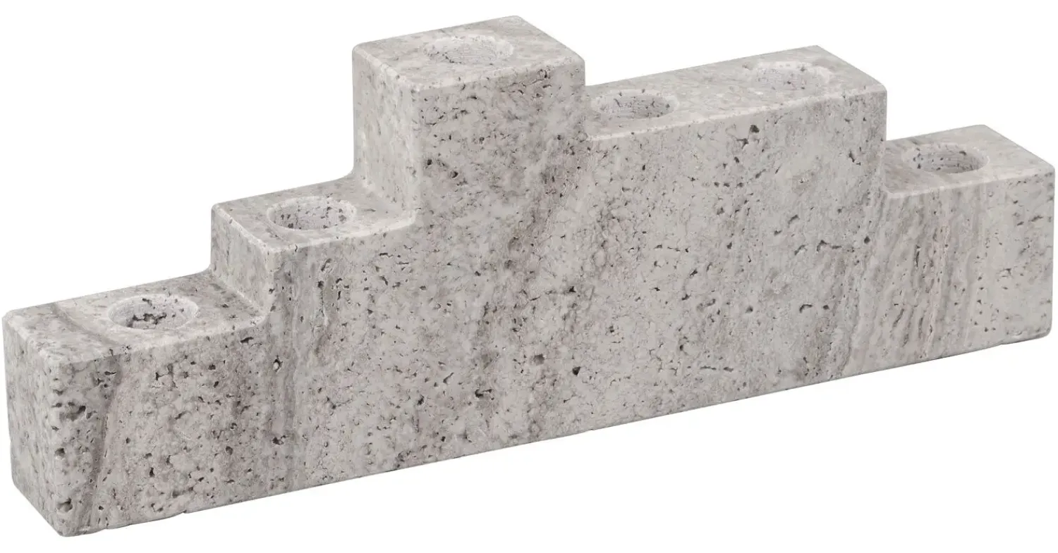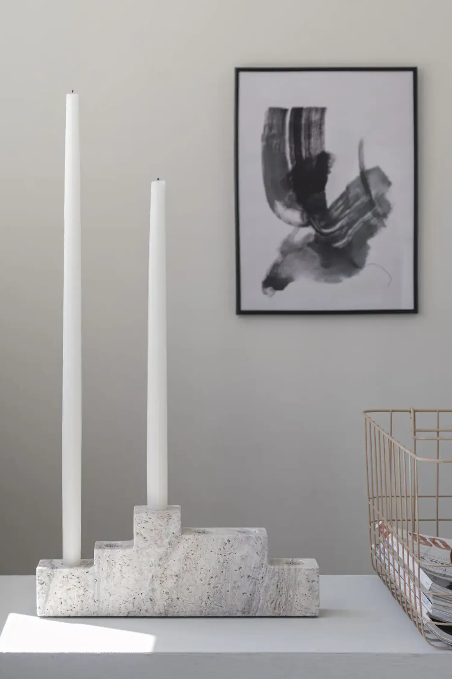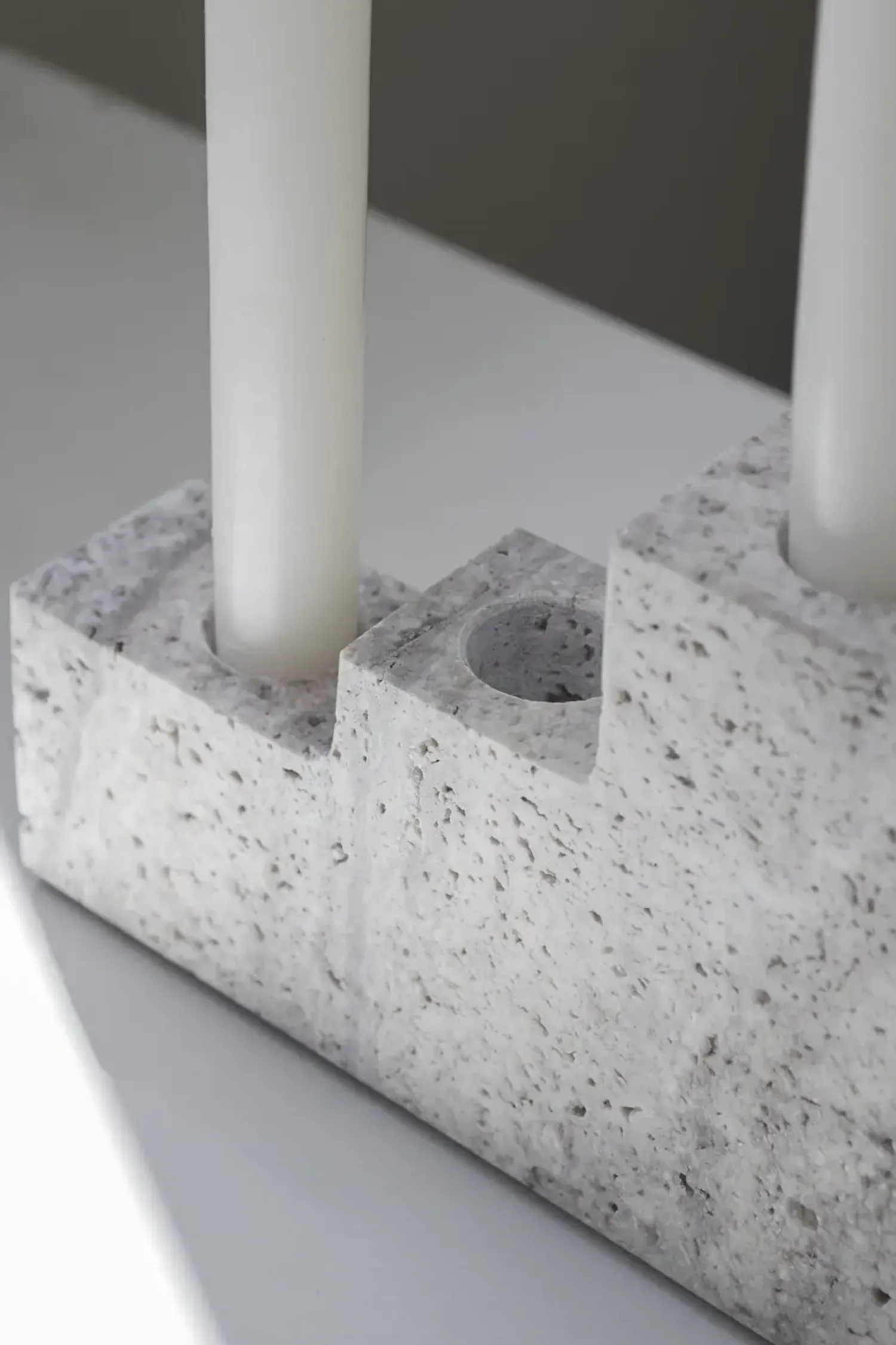 Fremstillet af lys travertin i sin reneste form, står lysestagen elegant med små fordybninger og huller, der er karakteristiske for materialet. Dette bidrager til dens unikke charme, da ikke to lysestager er ens. Lysestagen udstråler en rolig elegance og tilfører et naturligt dynamisk spil til enhver indretning.