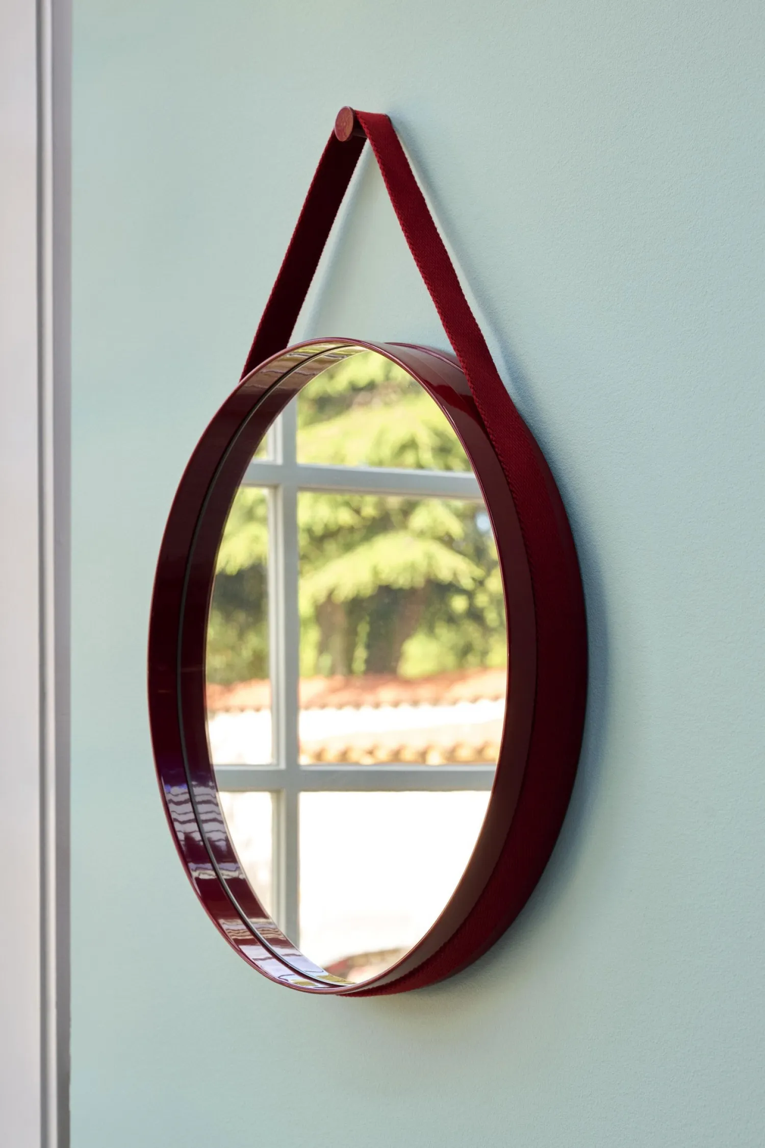 Dette runde spejl fra HAY kombinerer funktionalitet med et karakteristisk design. Med en diameter på 50 cm og en brun læderrem til ophængning får du et spejl, der nemt kan tilpasses din væg. Monteringssystemet gør opsætningen enkel.