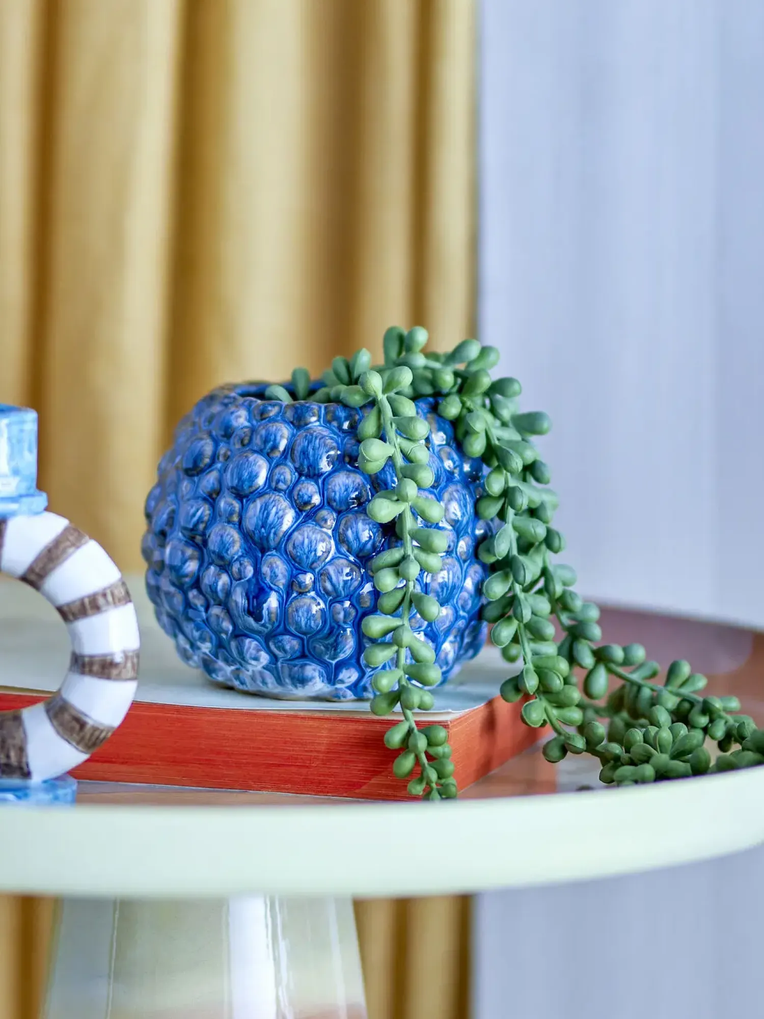 Susannah urtepotteskjuleren er kendetegnet ved sin særlige overflade. Den dybe blå farve varierer i nuancer på grund af den specielle glasur, hvilket gør hver enkelt krukke unik. Overfladen prydes af et mønster med små, afrundede former, der giver krukken karakter og dybde. Denne tekstur skaber en interessant kontrast til planternes naturlige former og tilføjer et ekstra visuelt element til din indretning.