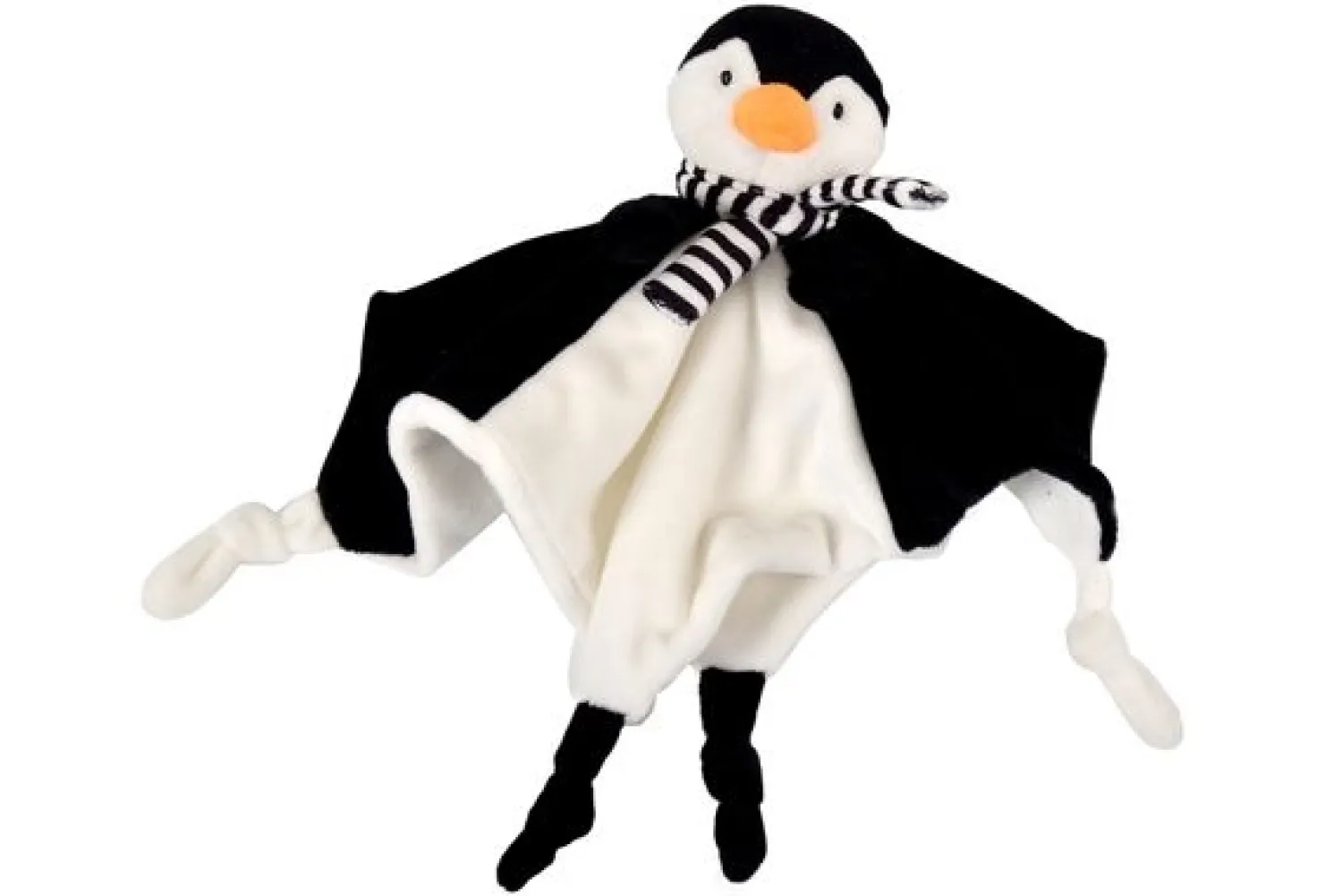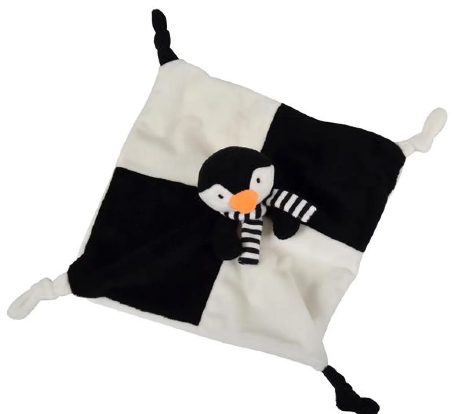 Med sin sorte farve og det karakteristiske pingvinmotiv er denne sutteklud designet til at blive en genkendelig genstand for barnet. Den kan bruges som en trøstende ledsager i forskellige situationer. Den kvadratiske form og de knyttede hjørner gør den nem for barnet at holde fast i.