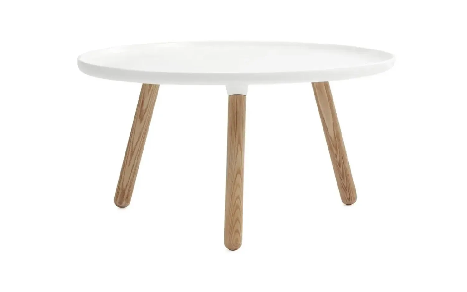 Dette sofabord kombinerer tre solide træben med en hvid, rund bordplade i et enkelt design. Benene skaber en naturlig varme i rummet, mens den hvide bordplade tilføjer et let og luftigt udtryk til din stue.