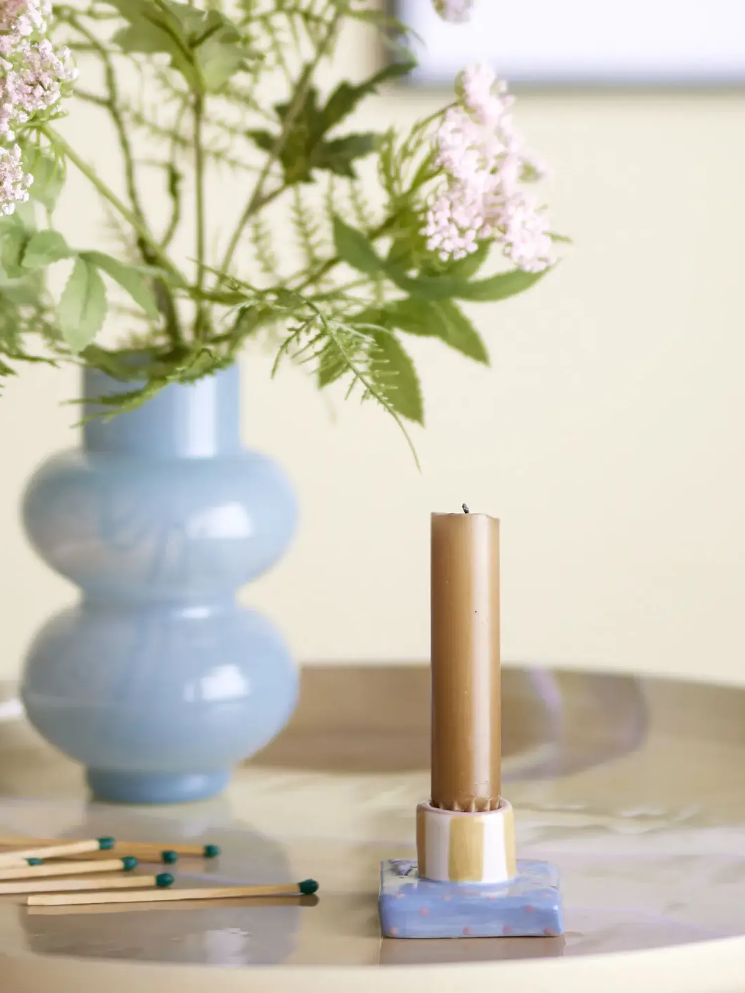 Denne lysestage fra Bloomingville er fremstillet i stentøj med glasur. Den har en cylindrisk form med firkantet base og et prikket mønster i blå nuancer med gule og hvide detaljer. Lysestagen er hånddekoreret, hvilket giver hver enkelt et individuelt præg.