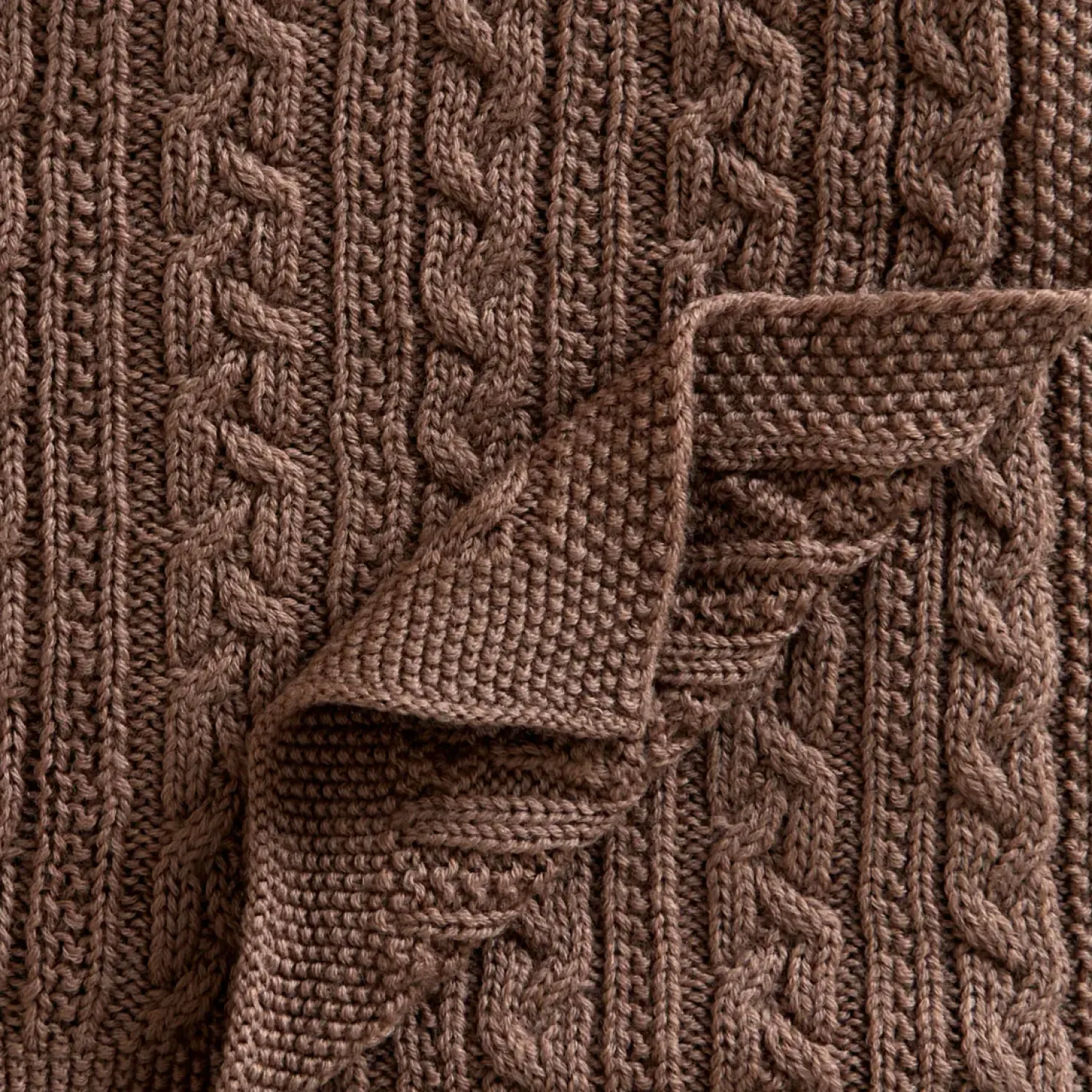 Dette tæppe udmærker sig ved sit smukke kabelstrikmønster, der giver en taktil og visuel dybde. Den brune farve og bløde merinould skaber en varm atmosfære i ethvert rum. Ideelt som dekorativt element eller til at putte sig under på kølige aftener.