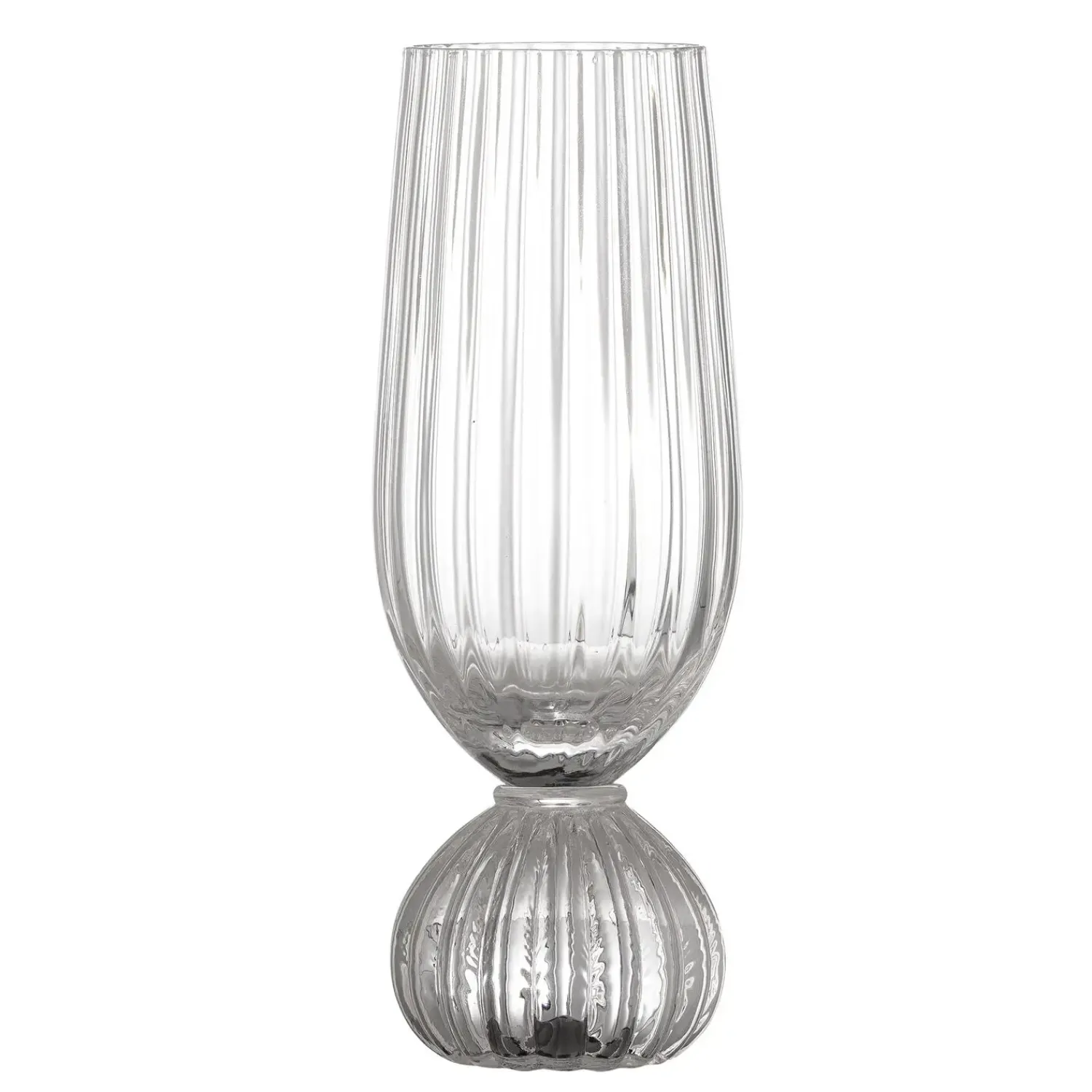 Dette mundblæste champagneglas fra Bloomingville har karakteristiske lodrette ribber og en særpræget rund bund. Hvert enkelt glas har små naturlige variationer, der gør dit glas unikt. Glasset rummer 250 ml.