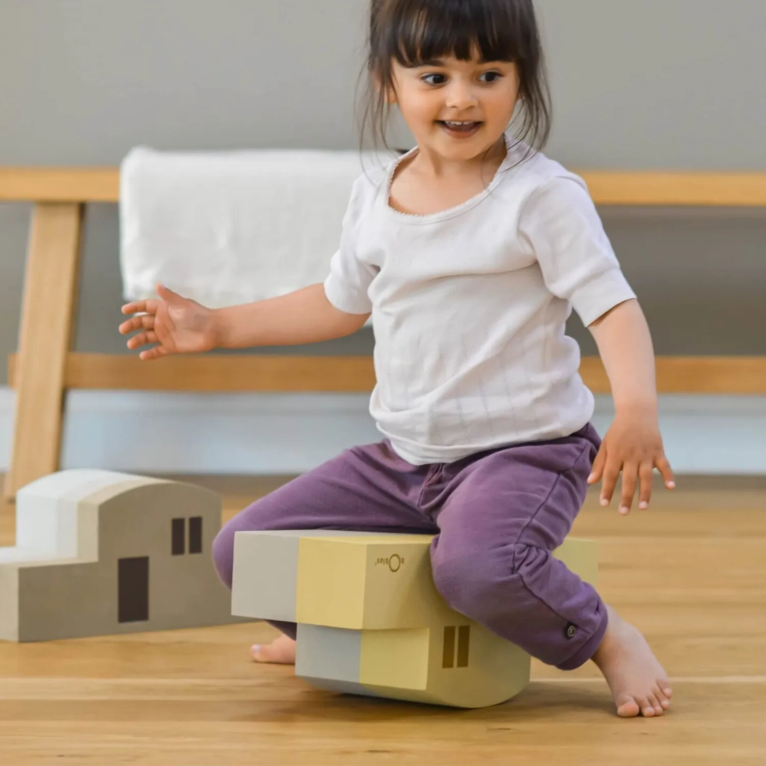 Town House Factory Stockholm er formet som et geometrisk hus, der stimulerer børns fantasi og motorik gennem aktiv leg. Produktet fungerer som skammel eller trappe i hverdagen, hvilket giver praktisk anvendelse i hjemmet, mens det samtidig inviterer til kreativ udfoldelse.