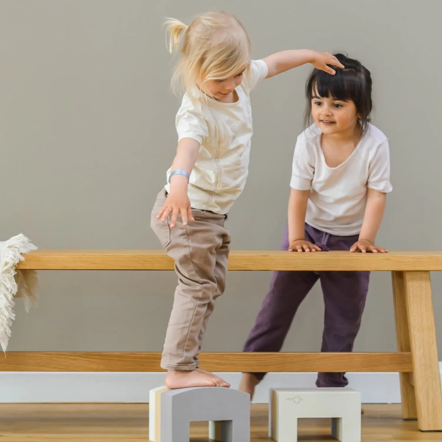 Som skammel giver den stabil støtte til dit barn, mens vippe-skammel-funktionen tilføjer bevægelse og balancetræning til legen. Det flerfarvede design med lagdelte toner i grå, beige og hvid passer ind i forskellige indretninger, og de buede udskæringer i konstruktionen skaber både æstetik og funktionalitet.