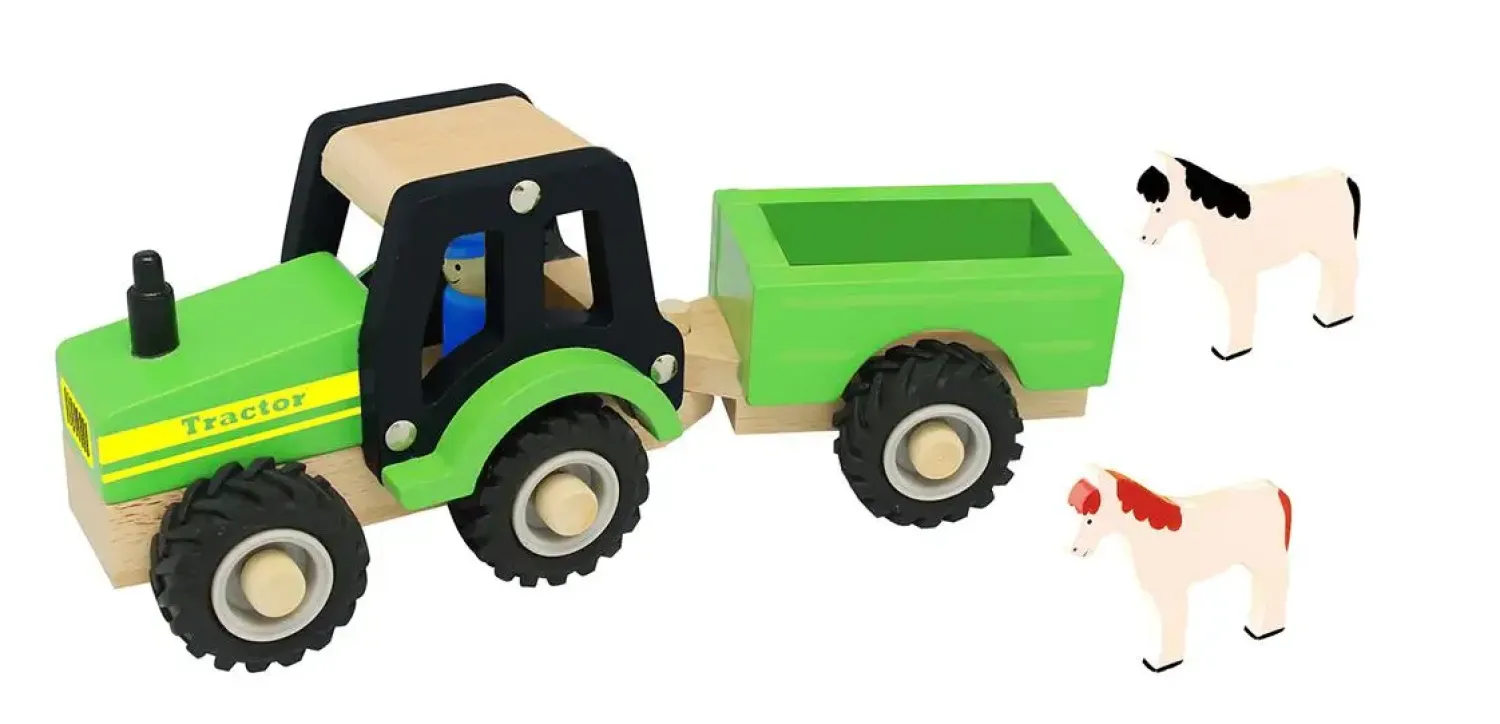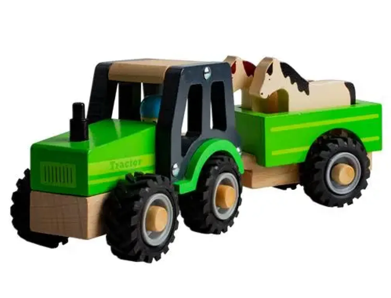 Denne trætraktor med anhænger og dyr er designet til at repræsentere landlivet i legetøjsform. Legesættet er beregnet til børn fra 2 år og opefter og består af en traktor med aftagelig anhænger samt dyrefigurer.
