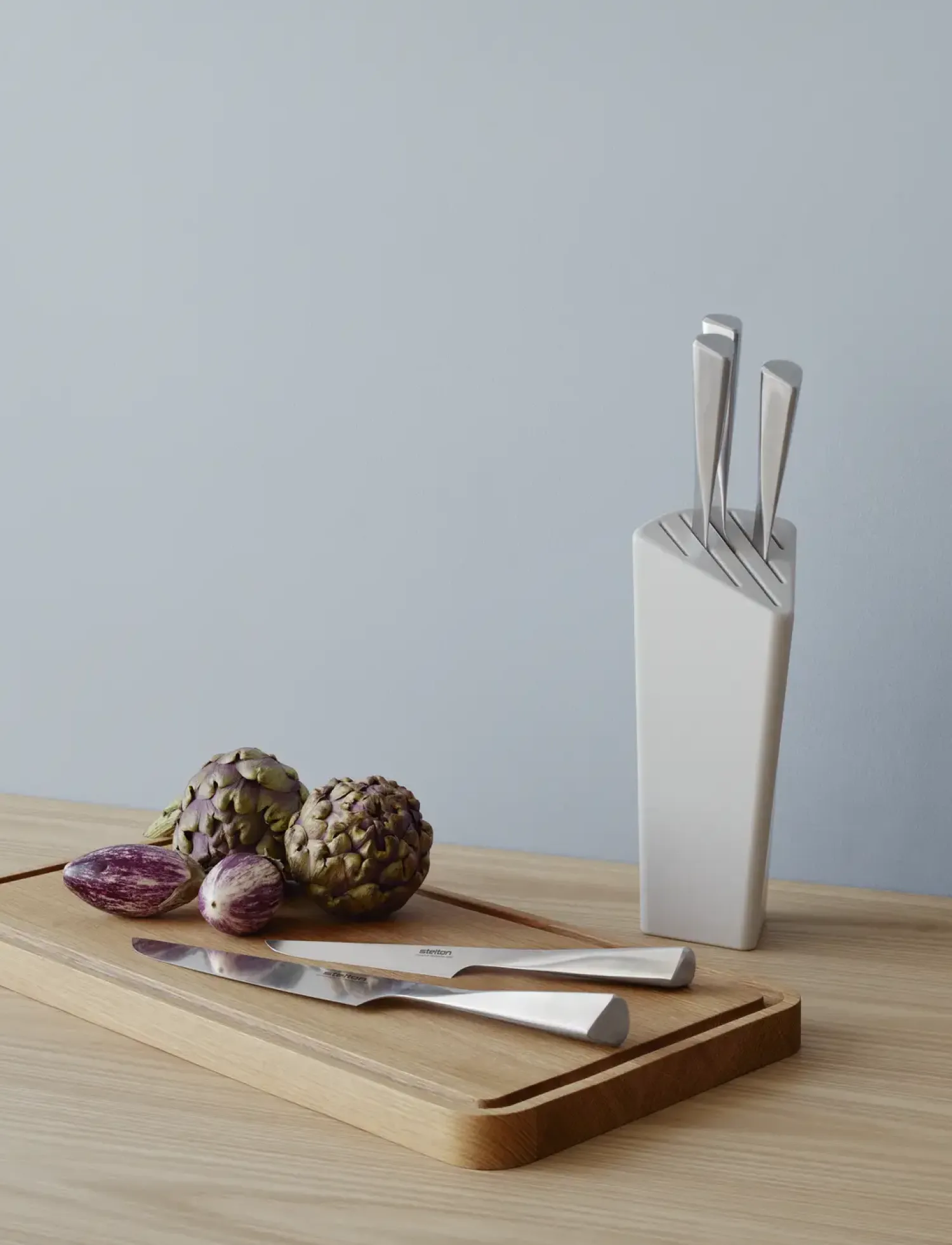 Trigono santokukniven er fremstillet i japansk Chromium 18 stål, et særdeles slidstærk rustfri stål, der sikrer Trigono-knivene enestående skarphed. Chromium 18 stål har en perfekt balance mellem slidstærk hårdhed og slibevenlig blødhed, der resulterer i skarpe knive der er nemme at vedligeholde. Den enestående vægtafbalancering og knivskaftets triangulære form giver tilsammen et sikkert og behageligt greb til alle håndstørrelser. Trigono er en knivserie bestående af fem forskellige knive til hvert sit formål. De er designet af den danske arkitekt Simon Kalmer. Trigono brødkniven er fremstillet i japansk Chromium 18 stål, et særdeles slidstærk rustfri stål, der sikrer Trigono-knivene enestående skarphed. Chromium 18 stål har en perfekt balance mellem slidstærk hårdhed og slibevenlig blødhed, der resulterer i skarpe knive der er nemme at vedligeholde. Den enestående vægtafbalancering og knivskaftets triangulære form giver tilsammen et sikkert og behageligt greb til alle håndstørrelser. Trigono er en knivserie bestående af fem forskellige knive til hvert sit formål. De er designet af den danske arkitekt Simon Kalmer.