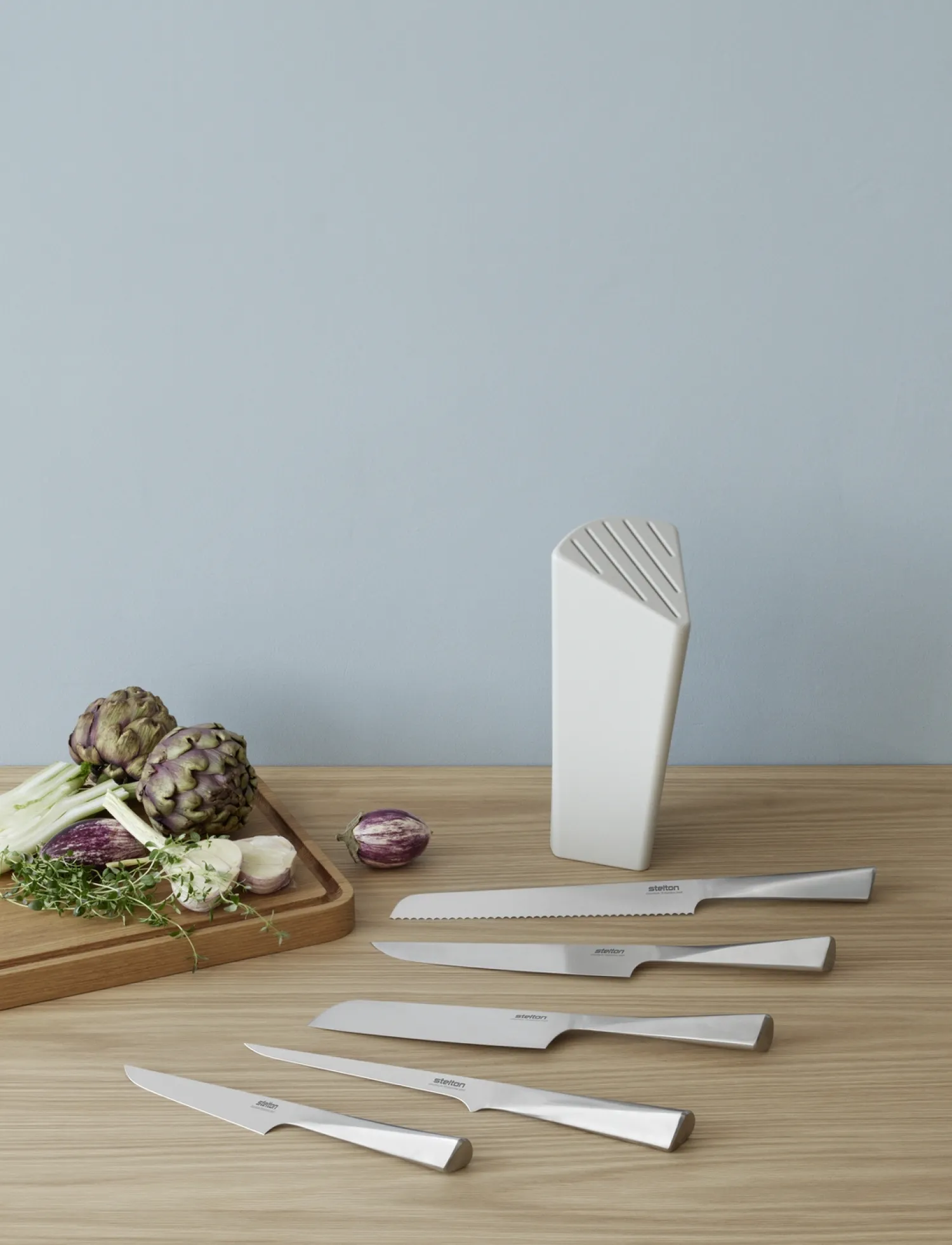 Trigono udbenerkniven er fremstillet i japansk Chromium 18 stål, et særdeles slidstærk rustfri stål, der sikrer Trigono-knivene enestående skarphed. Chromium 18 stål har en perfekt balance mellem slidstærk hårdhed og slibevenlig blødhed, der resulterer i skarpe knive der er nemme at vedligeholde. Den enestående vægtafbalancering og knivskaftets triangulære form giver tilsammen et sikkert og behageligt greb til alle håndstørrelser. Trigono er en knivserie bestående af fem forskellige knive til hvert sit formål. De er designet af den danske arkitekt Simon Kalmer.