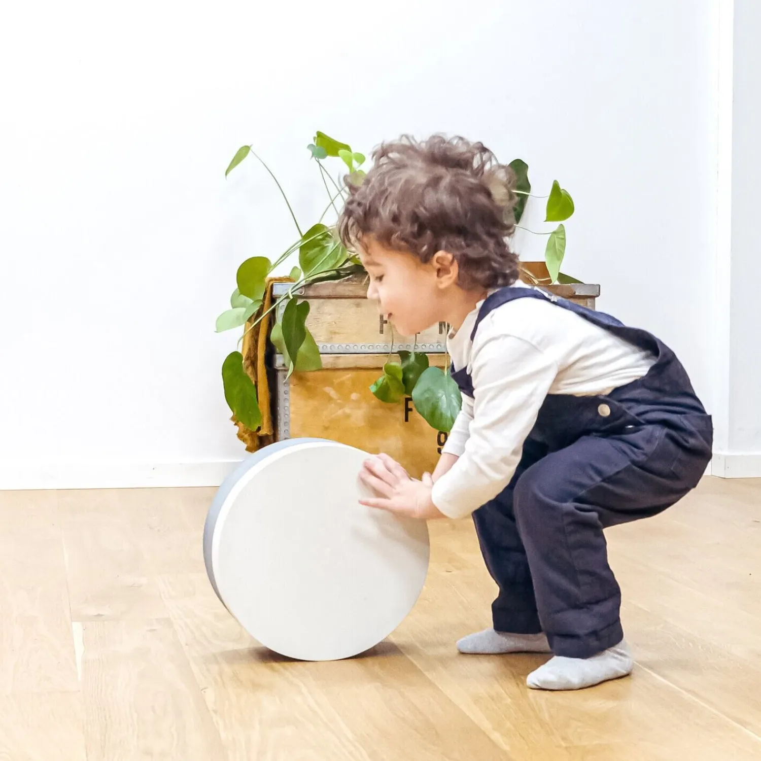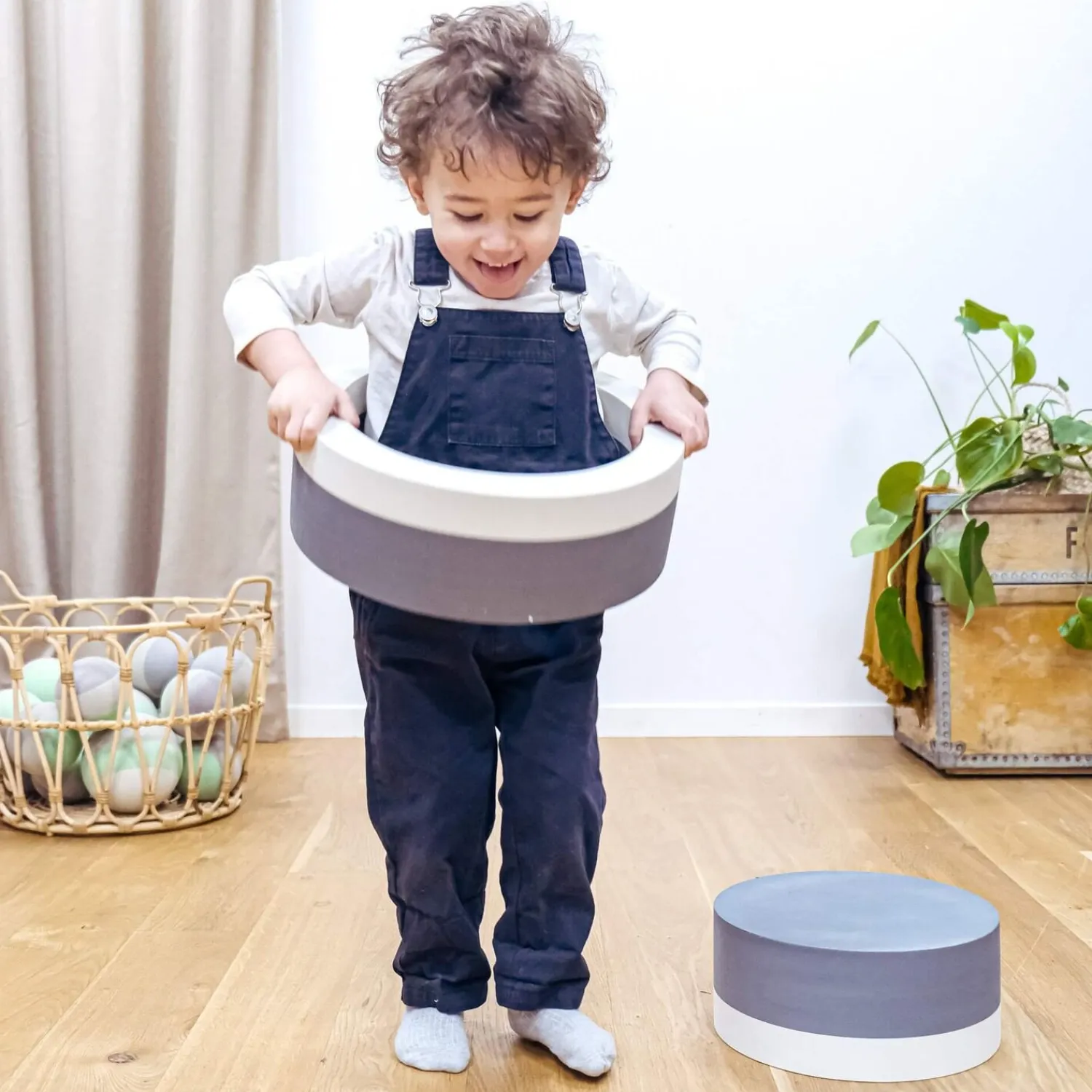Dette tumlerør fra bObles består af en cylinder med et hult center, designet til at invitere børn til aktiv leg. Den grå farve, kombineret med hvid, giver et stilfuldt udtryk, der passer ind i de fleste hjem. Produktet styrker barnets motoriske færdigheder gennem bevægelse, balance og kreativ udfoldelse.