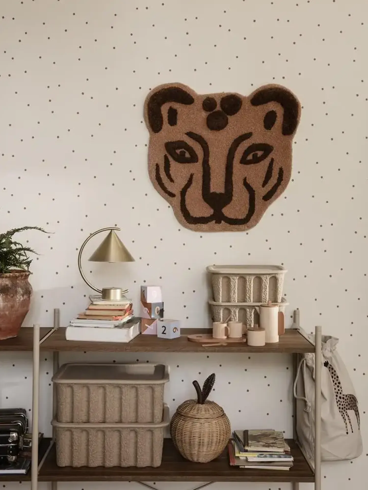 Denne bløde tilføjelse til børneværelset er et legende og stofligt indslag i dit barns rum. Det håndknyttede tæppe er formet som et venligt leopardhoved, hvilket tilfører legen et sensorisk element og gør dette vægtæppe både sjovt og unikt. Vægbeslag inkluderet. Forskellige højde på tekstilet, for at fremhæve konturerne i tæppet.