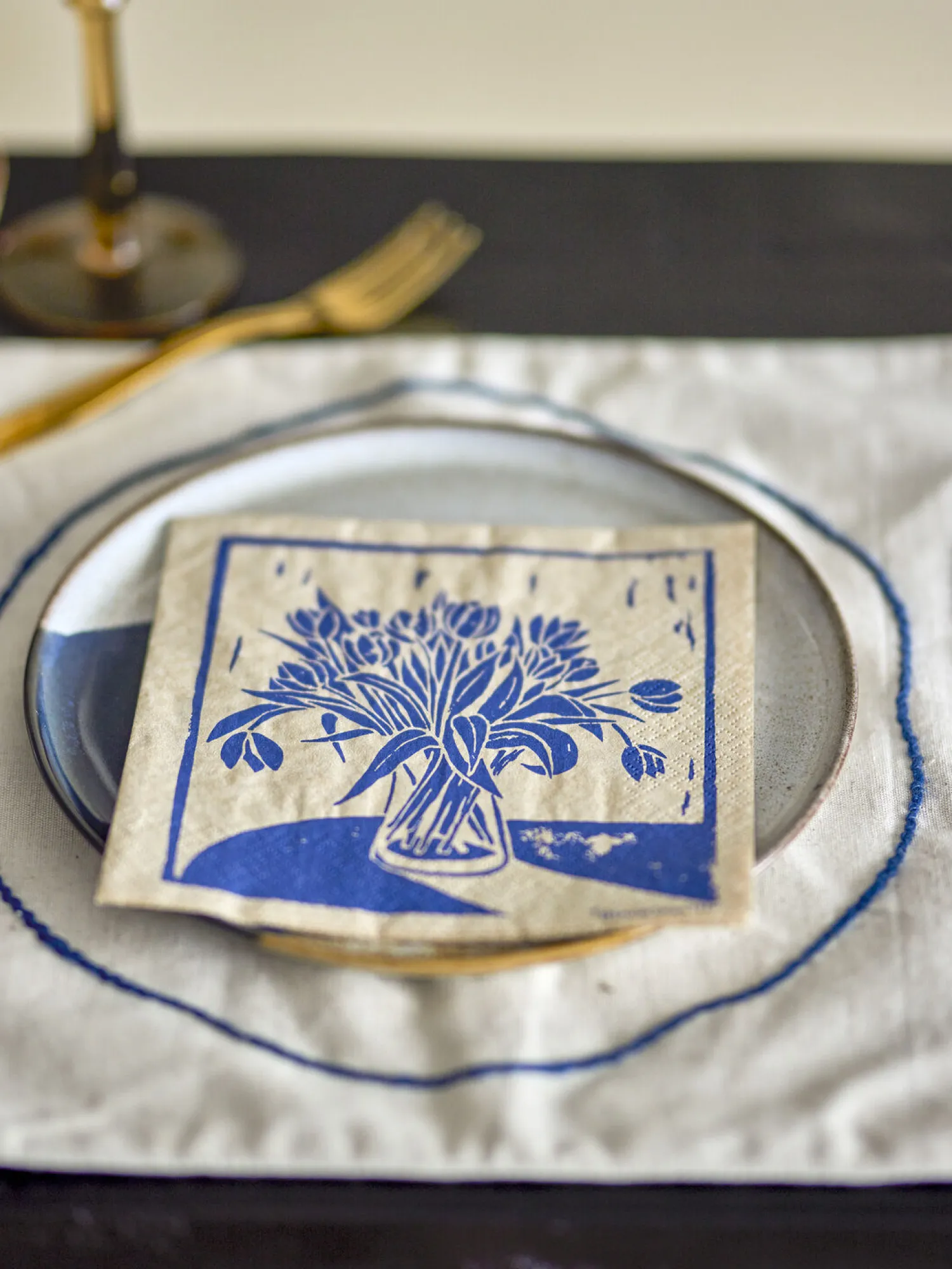The Tulips Napkin fra Bloomingville er et sæt med 20 servietter med et smukt blåt motiv af en vase med tulipaner. Motivet er lavet af et linoleumsprint, som giver et helt særligt udtryk. Den naturlige farve fra det FSC-certificerede genbrugspapir fremhæver smukt den blå nuance. Brug dem til at pynte op til en festlig lejlighed eller til at skabe en hyggelig stemning i hverdagen.