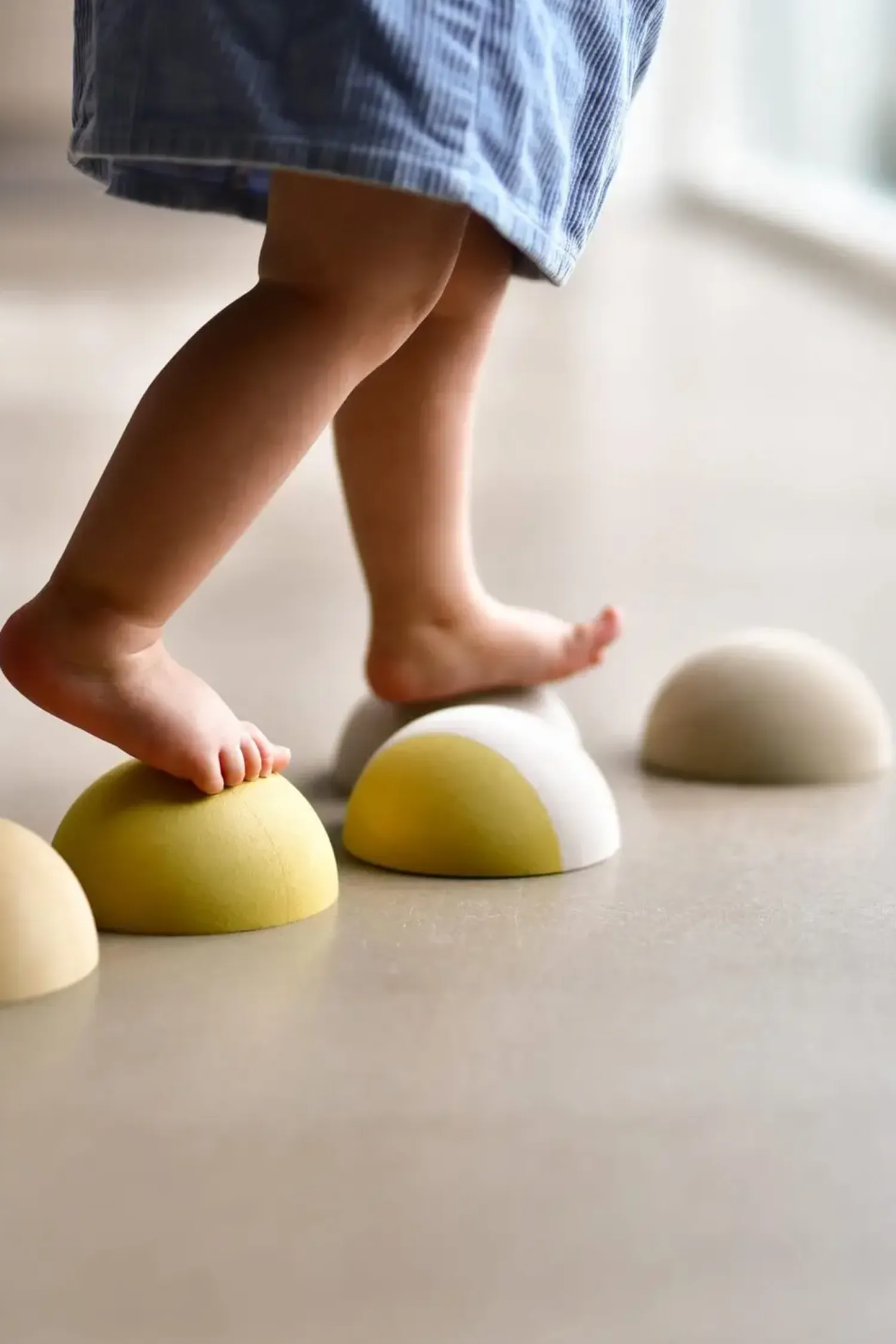 Farverne i gul og beige gør sættet visuelt behageligt i hjemmet, mens funktionen forbliver i fokus. Stenene kan arrangeres i forskellige mønstre og bruges individuelt eller sammen, hvilket giver fleksibilitet i legen og tilpasning til barnets udviklingsniveau.