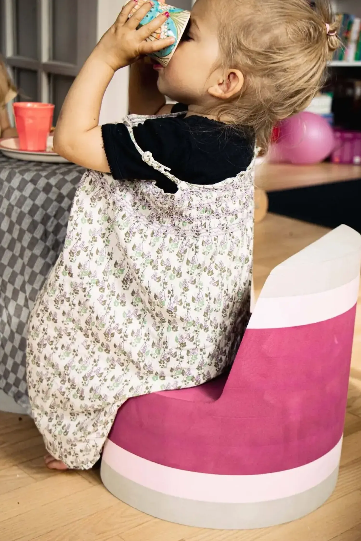 Cylinderen kan bruges som et lille bord eller som ekstra siddeplads, når du har brug for det. Stolen kan også lægges på ryggen for at skabe to vippe-siddepladser. Denne alsidighed giver dig flere måder at indrette børneværelset på uden at skulle investere i separate møbler.