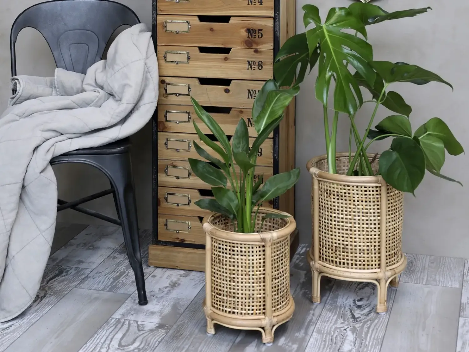 Det omhyggeligt udførte fletværk i rattan skaber et smukt spil af lys og skygge. Kurvemønsteret giver urtepotteskjuleren en unik tekstur og visuel interesse. De fire afrundede ben løfter potteskjuleren og giver den et let udtryk. Den cylindriske form er designet til at passe til forskellige typer af plantepotter, især dem med en diameter på op til 30 cm. Dette gør urtepotteskjuleren velegnet til en bred vifte af indendørs planter.
