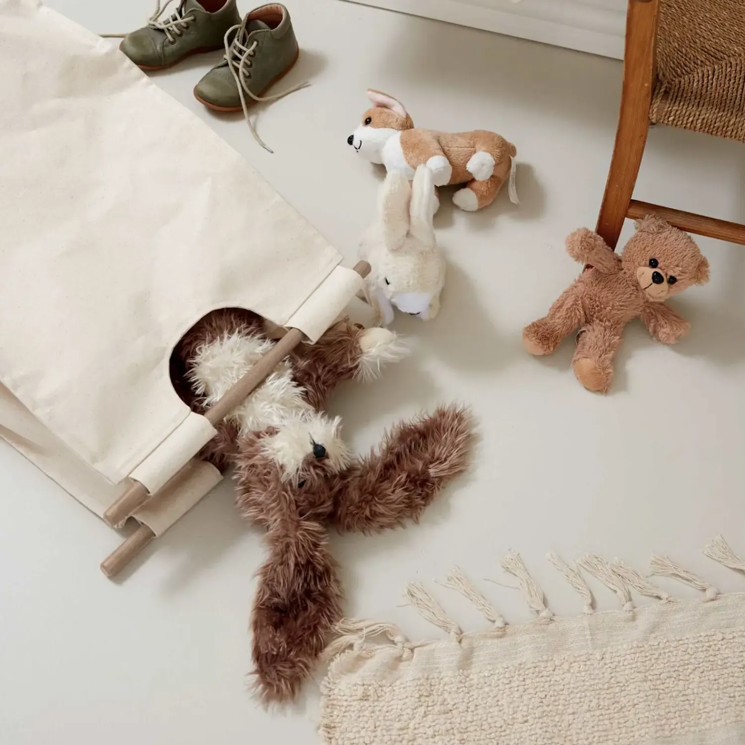 Materiale: GOTS certificeret tekstil, egetræspinde, metalkrog