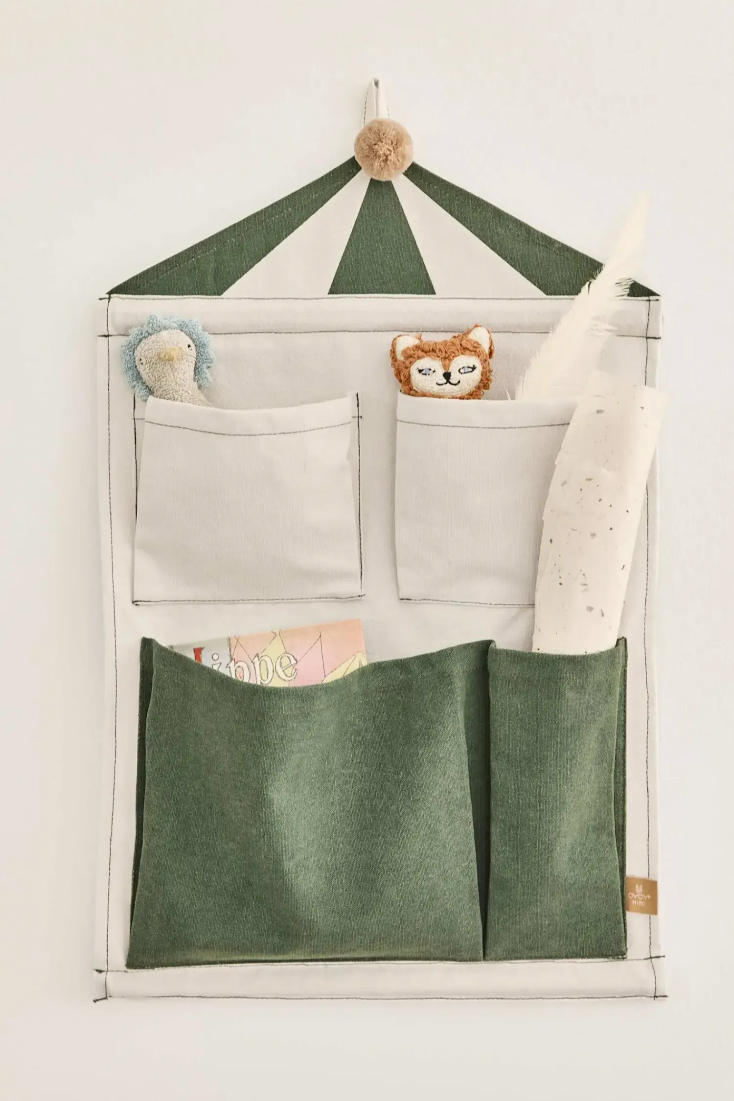 Det grøn- og hvidstribede design med den karakteristiske pompon på toppen tilfører et friskt præg til din væg. Organizeren passer særligt godt ind i rum, hvor du har brug for at kombinere praktisk opbevaring med et stilrent udtryk.