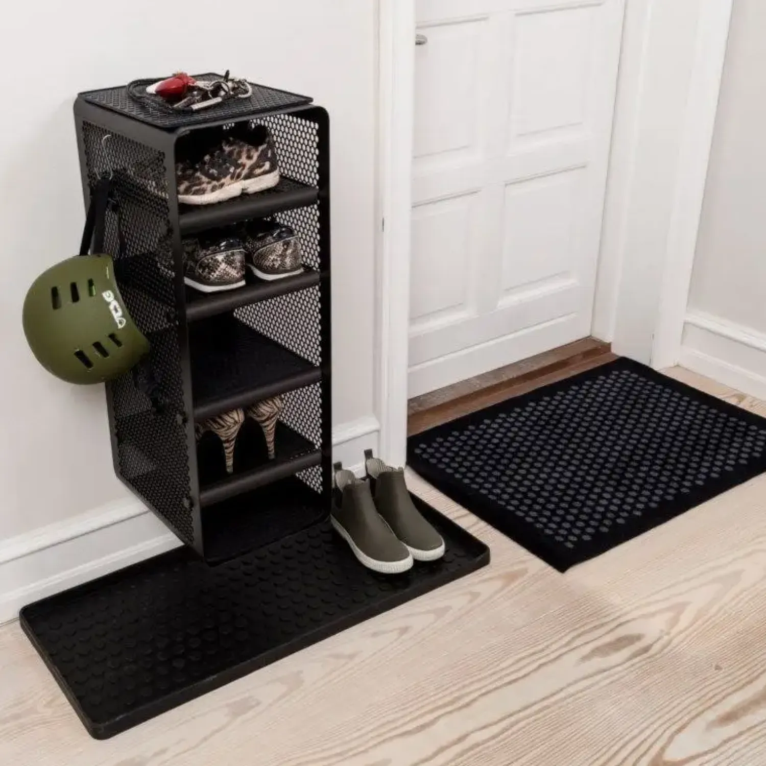 Siderne på reolen kan bruges til nøgler, cykelhjelm eller andet, da der kan hænge s-kroge. Reolen kan hænges på to måder – enten med hylderne mod front eller med reolen parallelt med væggen. Reolen er inklusiv 4 flytbare hylder. Brug også reolen til opbevaring af ting og sager