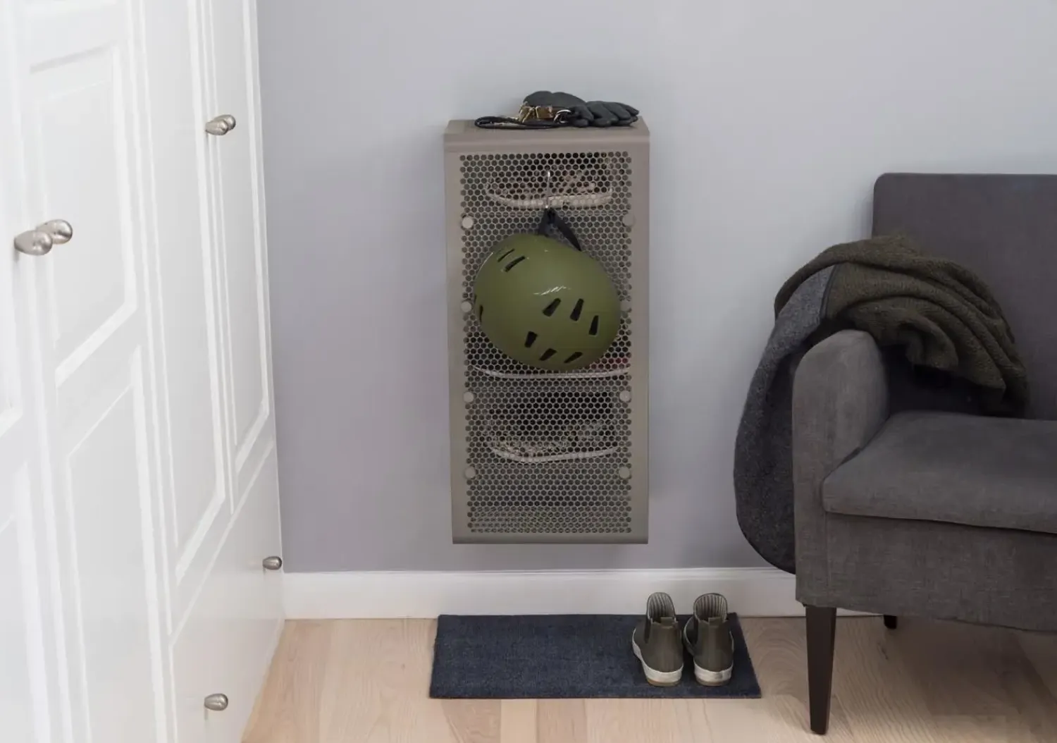 Den smarte vægreol i mat grå fra Tica Copenhagen er lavet i perforeret metal med et fint hulmønster. Det hullede mønster i siderne og formen på reolen står i fin kontrast til metallet, så helheden bliver harmonisk. Reolen er super fin som skoreol i entreen og kan også bruges i garderoben.