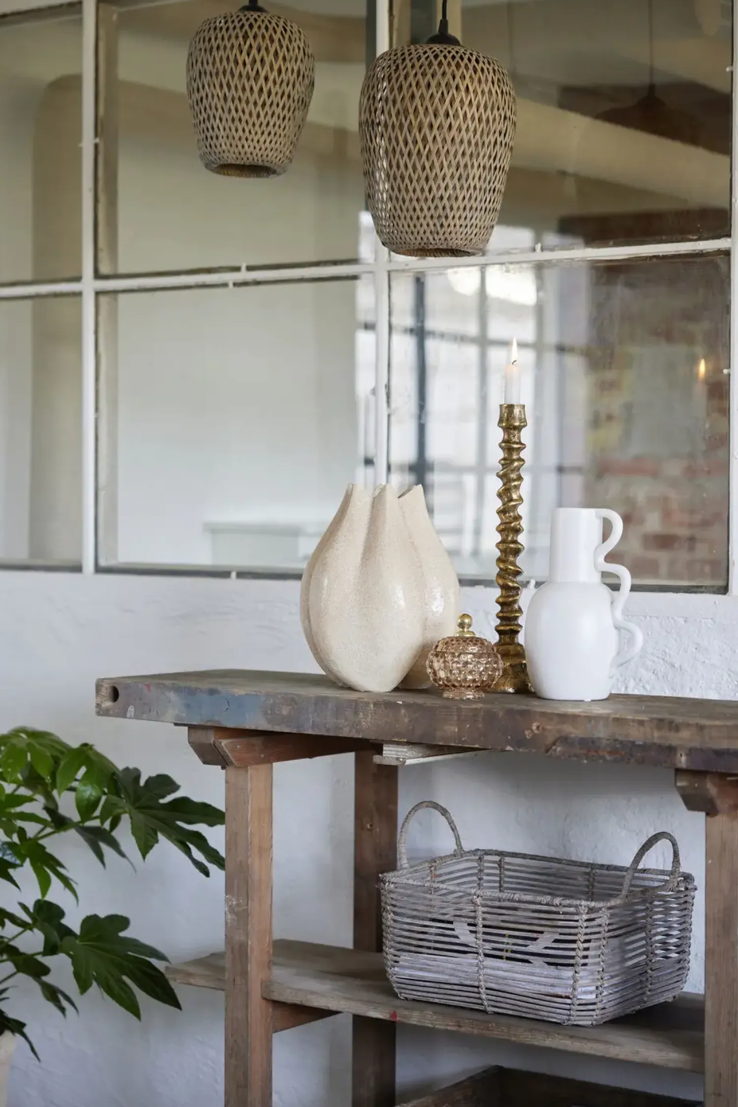 Materialets naturlige farve og tekstur tilføjer charme og gør den til en fantastisk tilføjelse til enhver boligindretning. Designet gør det nemt at placere og fylde den, så du kan være kreativ med din styling. Skab et minimalistisk og elegant look med denne vase fra valina.