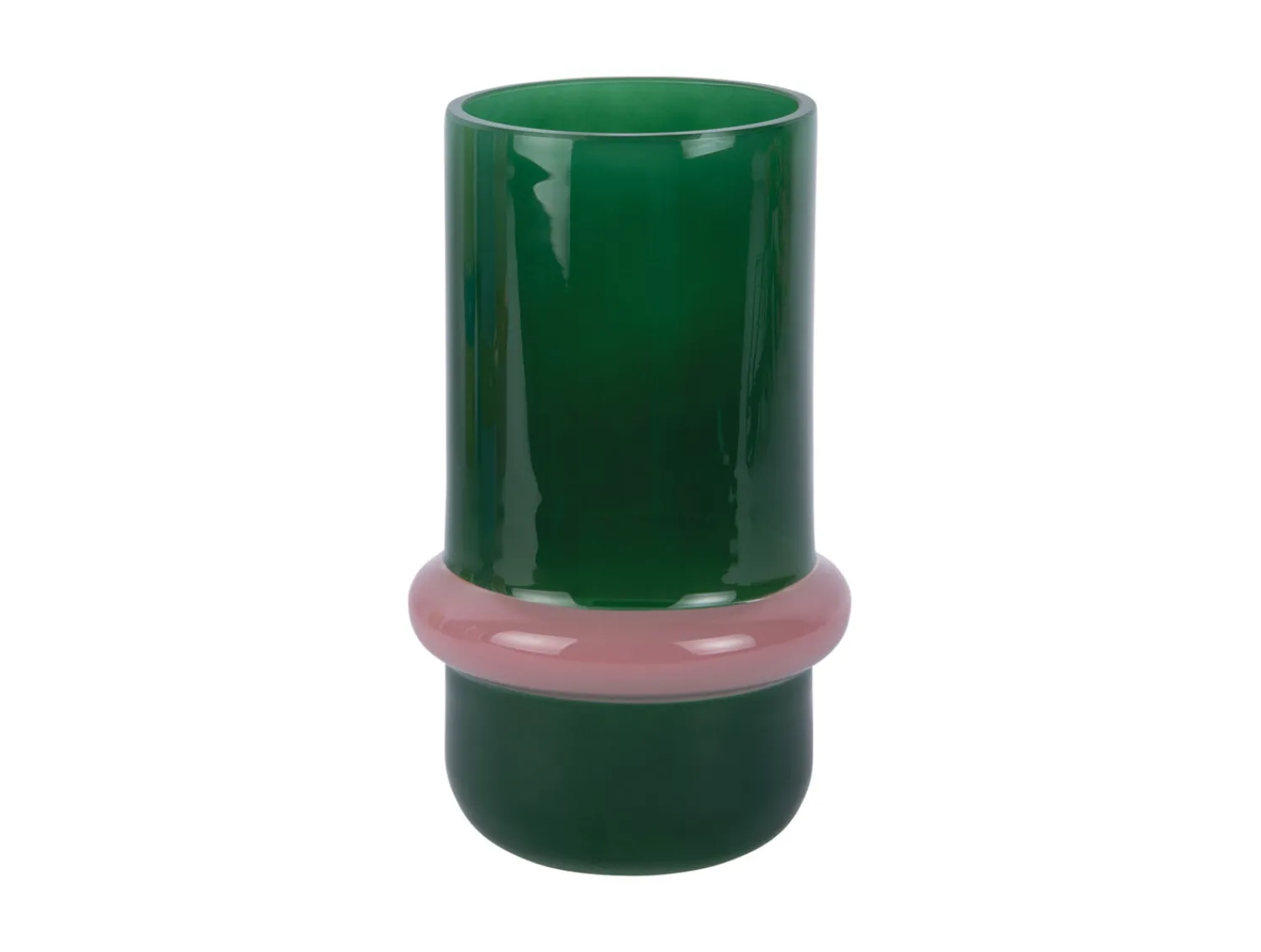 Denne vase fra Present Time kombinerer en retro grøn farve med en blød pink ring omkring midten. Glasmaterialet giver vasen en glat overflade og en holdbar konstruktion, der passer til moderne indretning. Den cylindriske form skaber et enkelt, men iøjnefaldende udtryk.
