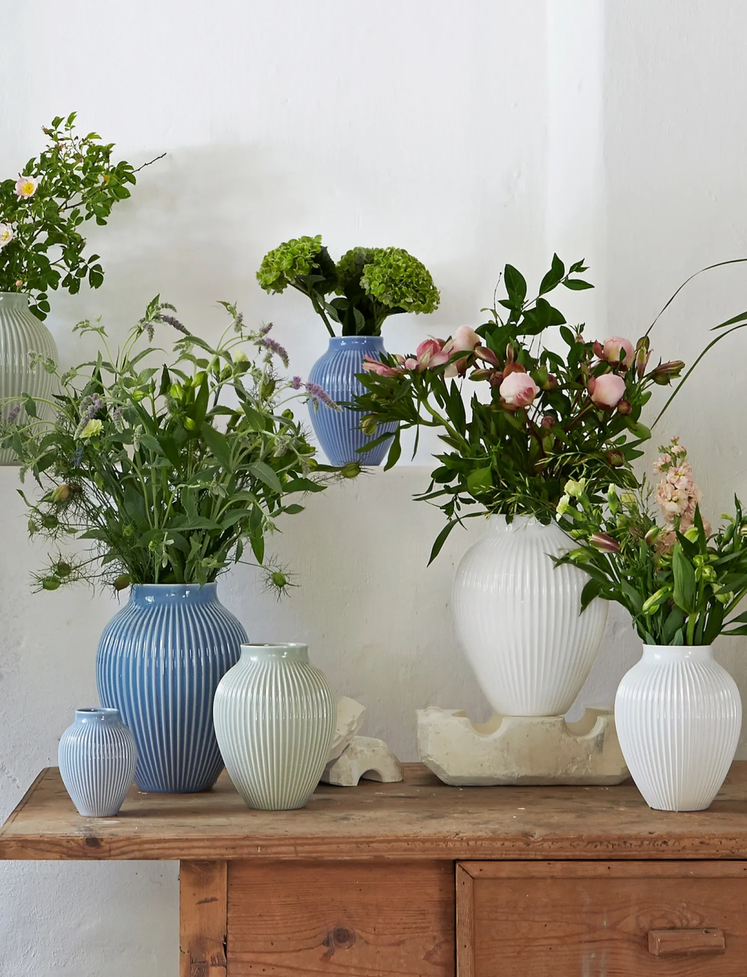 Gennem tiden har Knabstrup Keramik produceret et utal af smukke vaser i forskellige formgivninger. Denne vase er vi særligt stolte af. Den blev oprindeligt formgivet i slutningen af 1940’erne og med sin elegante og klassiske form er vasen et tidløst stykke keramik, der holder stilen langt ind i fremtiden. Knabstrup vasen er designet, så den ikke bare præsenterer sig selv, men også sæsonens blomsterbuketter og grene på smukkeste vis. Nu lanceres vasen med riller, hvilket giver den klassiske form helt nyt liv og giver et moderne og interessant udtryk, som passer perfekt ind i den nordiske boligindretning.