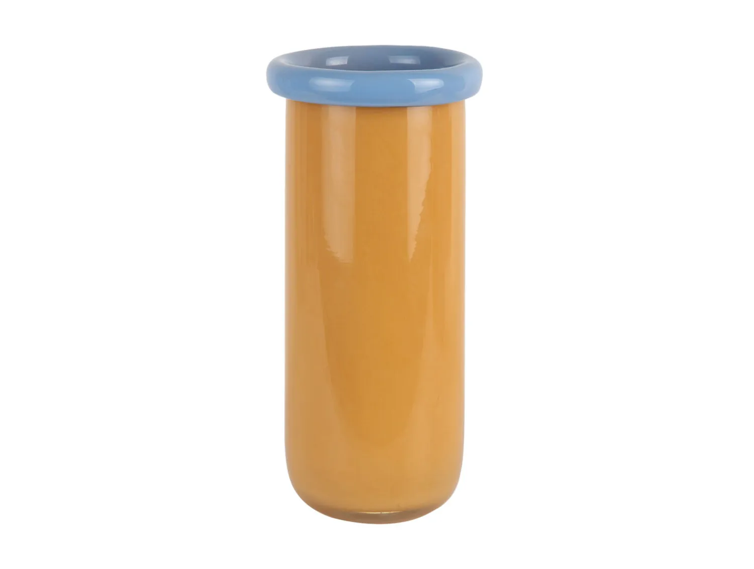 Den mango-gule farve med den bløde blå kant tilfører et farveaccent, der kan løfte neutrale rum eller supplere eksisterende farver. Glasmaterialet reflekterer lys og skaber dybde. Vasens cylindriske form giver struktur til dit arrangement, mens dimensionerne sikrer, at den ikke dominerer, men stadig er synlig i rummet.