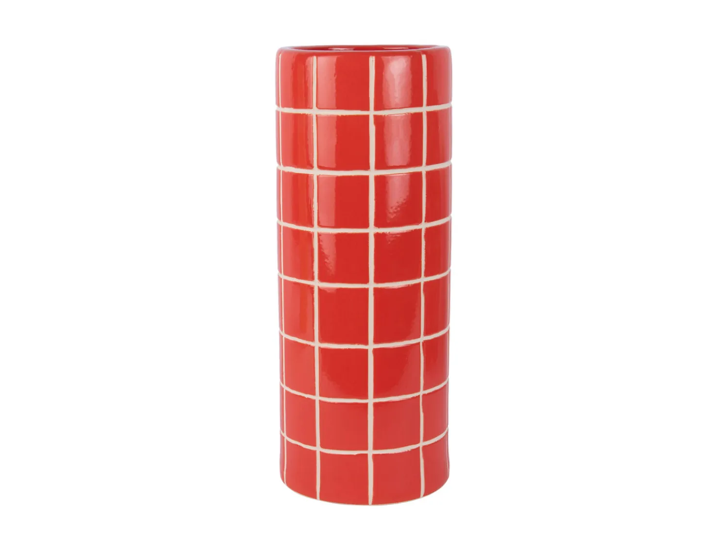 Denne vase har en cylindrisk form med et flisemønster, der dækker overfladen som et gitter af kvadrater. Den lyse skarlagenrøde farve giver et livligt præg, hvis du leder efter noget, der kan tiltrække opmærksomhed i dit hjem. Vasen er lavet af keramik, et holdbart materiale, der passer til mange indretninger.