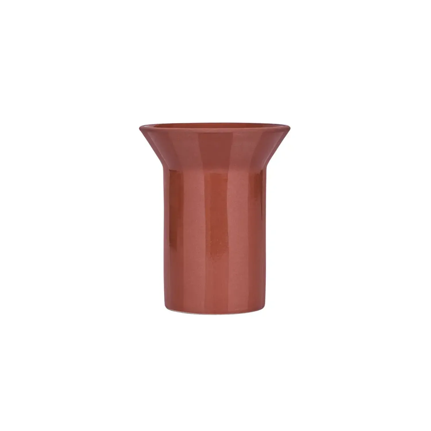 Denne individuelt formede vase er håndlavet i naturlig terrakotta med en karakteristisk cylinderform og blank overflade. Med målene L 6,5 x B 9,5 x H 11,5 cm passer den ideelt til mindre blomsterarrangementer eller som selvstændig dekoration.