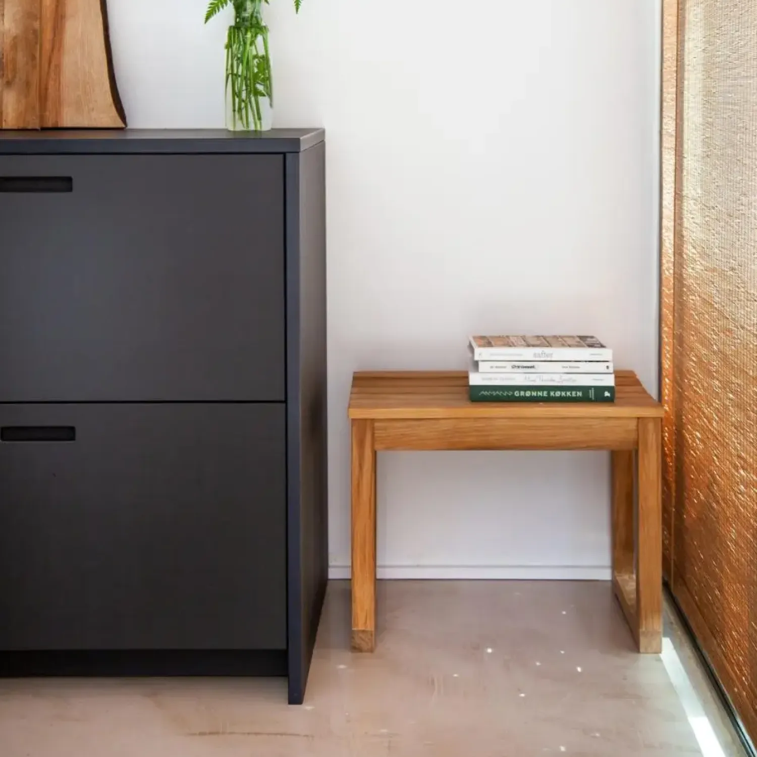 Vega skamlen er fremstillet af teaktræ, et materiale værdsat for sin naturlige skønhed og holdbarhed. Teaktræets særprægede åremønster giver hvert enkelt stykke karakter og gør det til et interessant element i indretningen. Skamlen afspejler en æstetik, der passer godt ind i det moderne hjem, hvor naturlige materialer og enkle former ofte er foretrukket. Træets naturlige egenskaber bidrager til skammelens overordnede kvalitet og udseende.