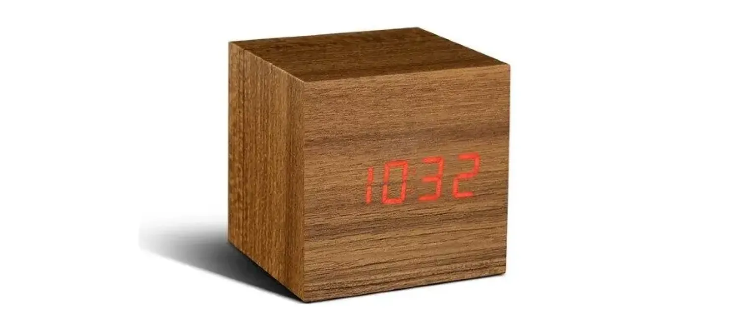 Gingko – Wooden Cube Click Clock Teak/ Red LED