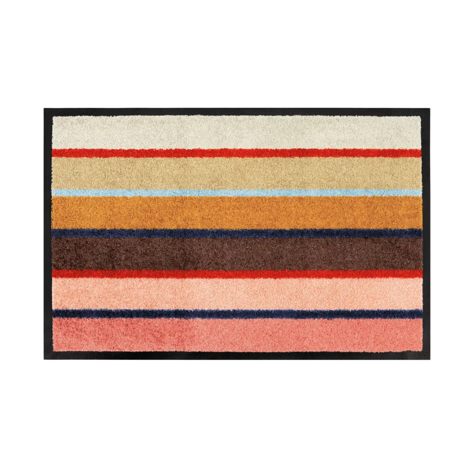 Giv din entré et livligt løft med denne iøjnefaldende dørmåtte fra Remember. Den farverige Zaza-model er designet til at kombinere praktisk funktionalitet med et trendy udseende. Med sine vandrette striber i levende nuancer og en elegant sort kant skaber denne måtte en indbydende atmosfære ved din indgang.