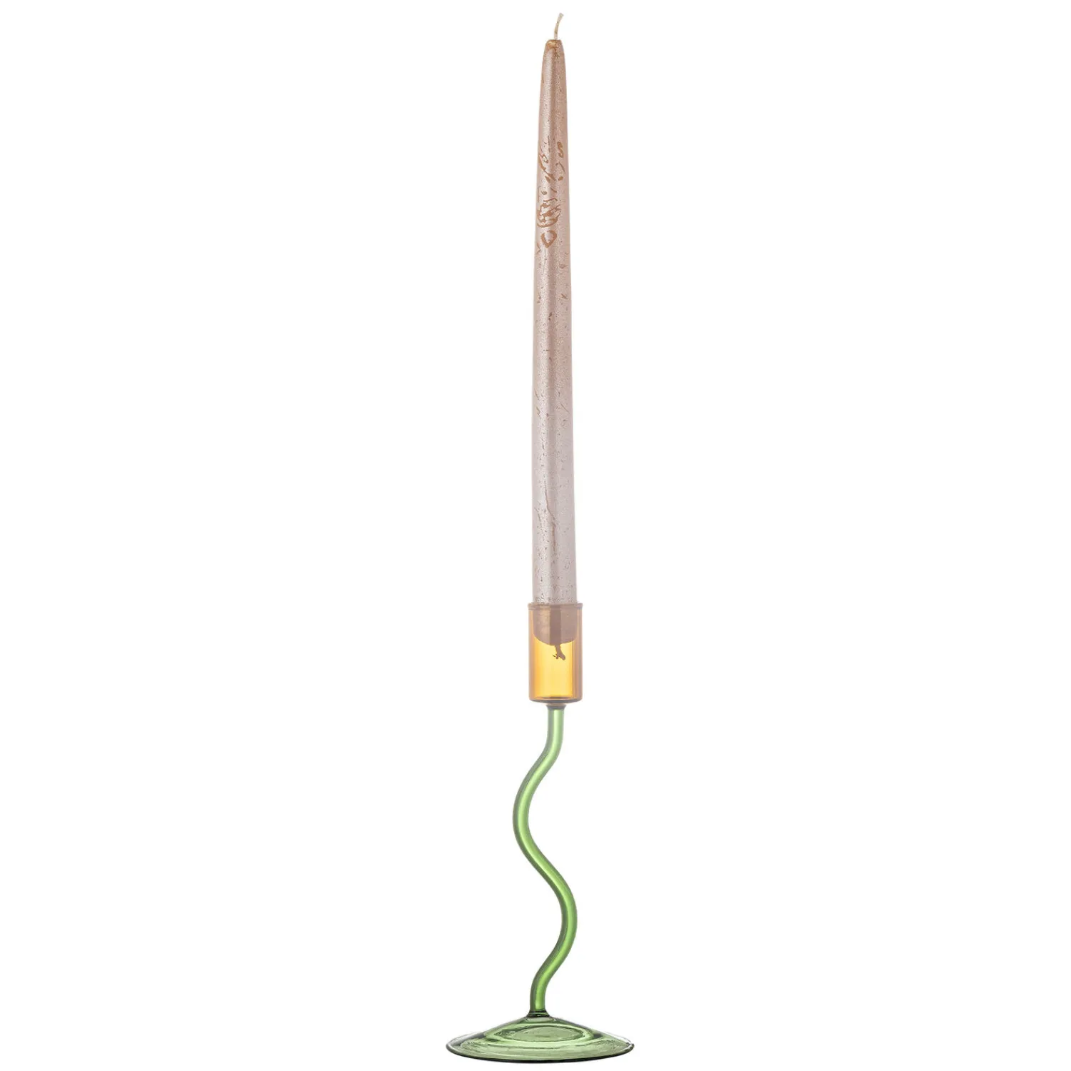 Den runde, flade fod sikrer god stabilitet, mens den cylindriske top holder sikkert på stearinlyset. Den grønne farve og den bølgede form skaber et interessant samspil, når lysestagen både er tændt og slukket.