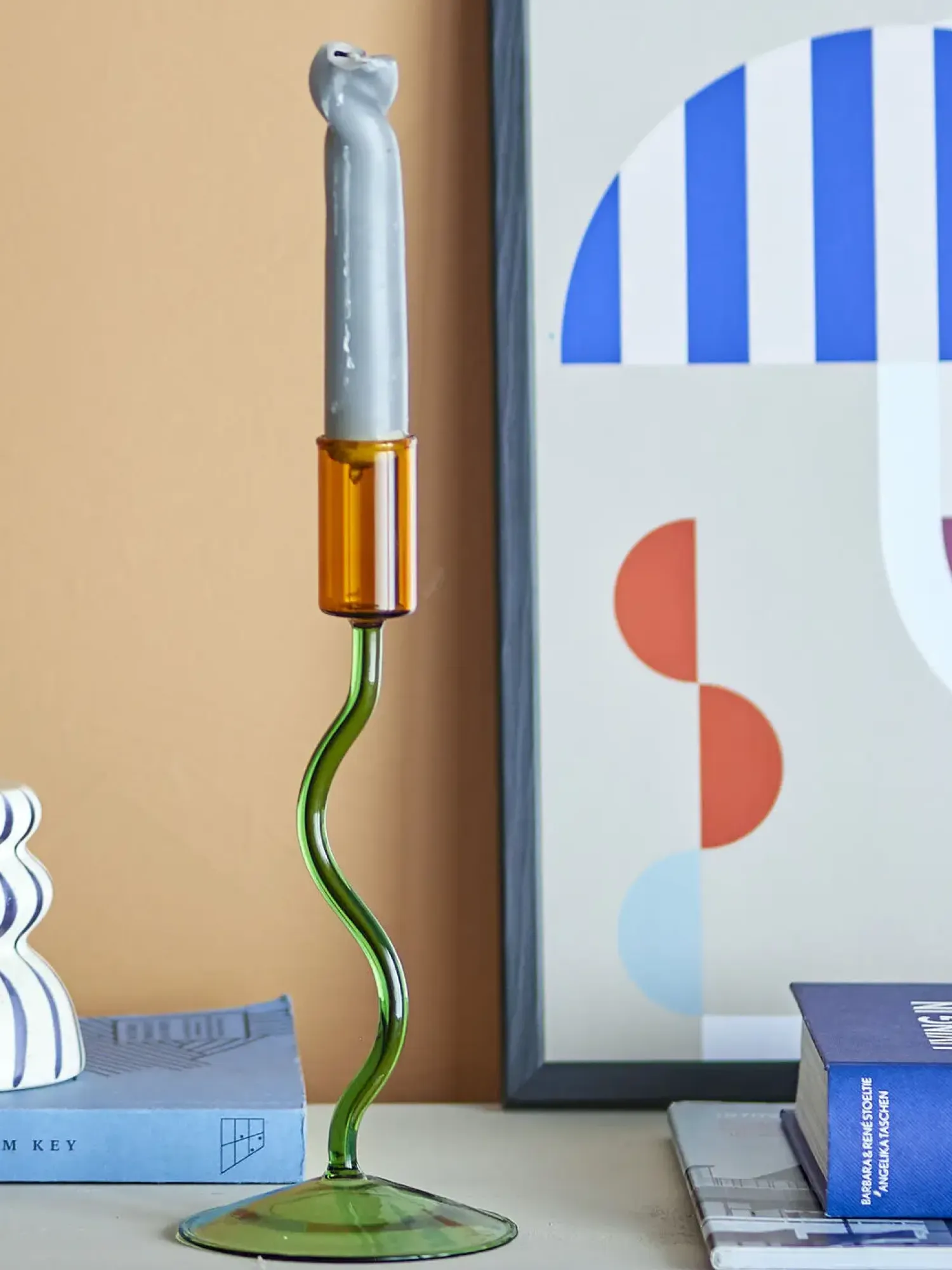 Denne mundblæste lysestage fra Bloomingville kombinerer en bølget stilk med en stabil, rund fod. Den grønne glaskonstruktion med kontrastfarvet top måler 22 cm i højden og 9 cm i diameter.