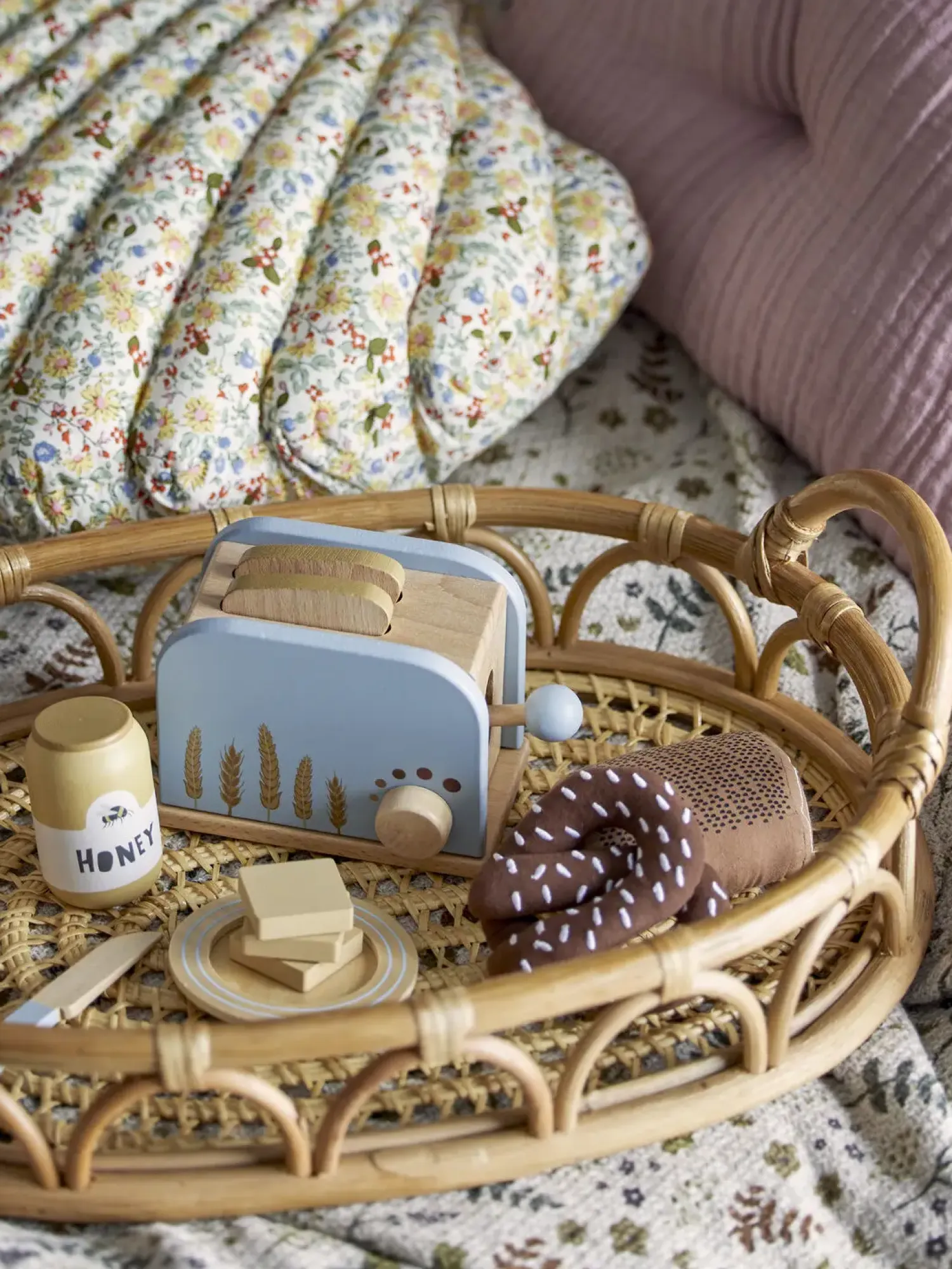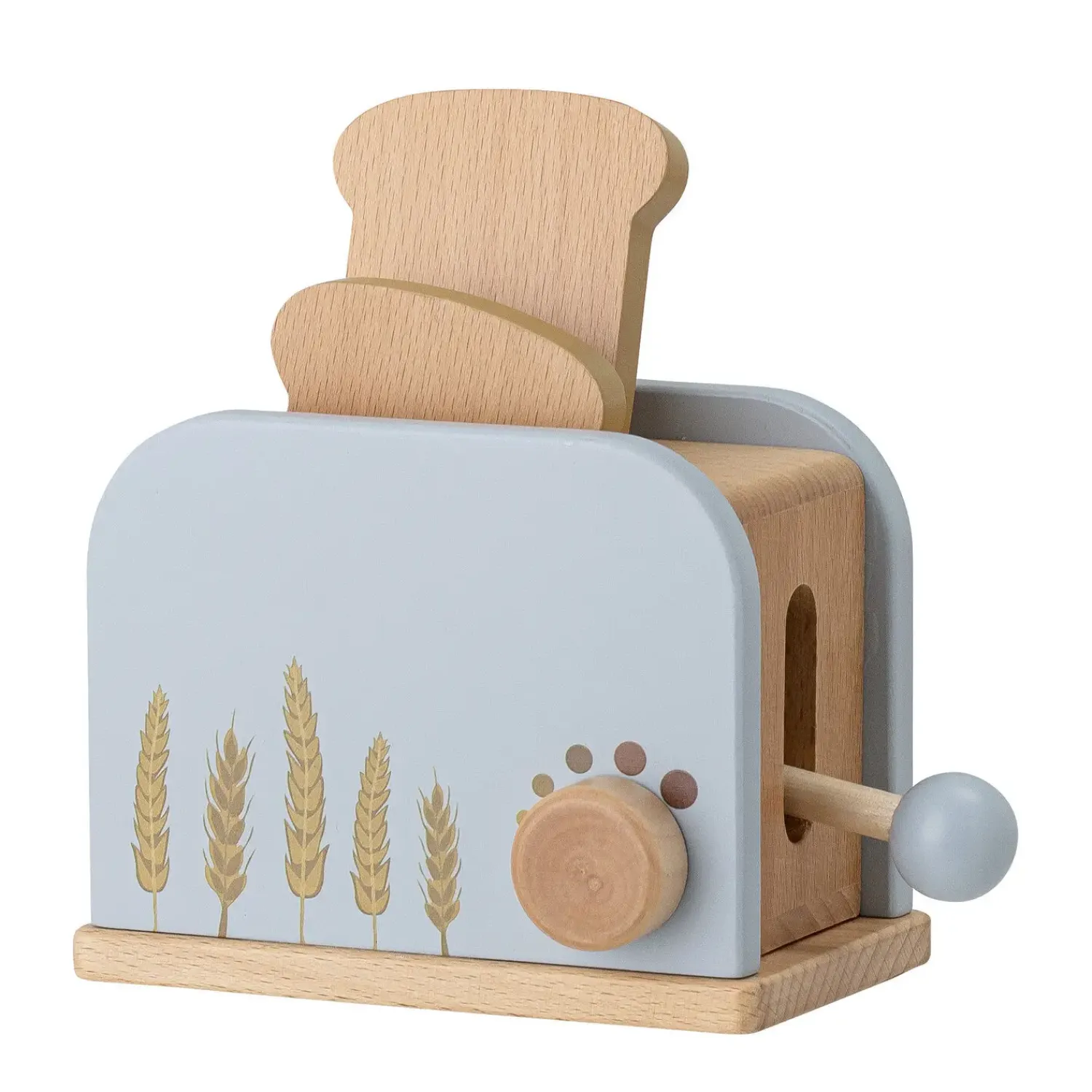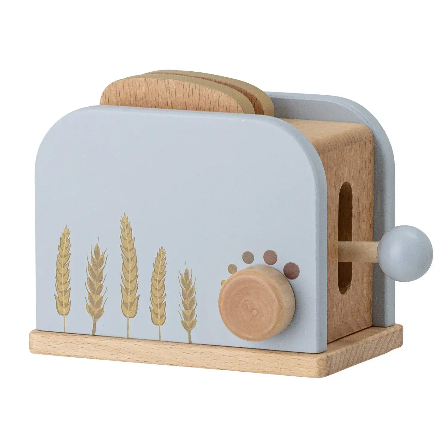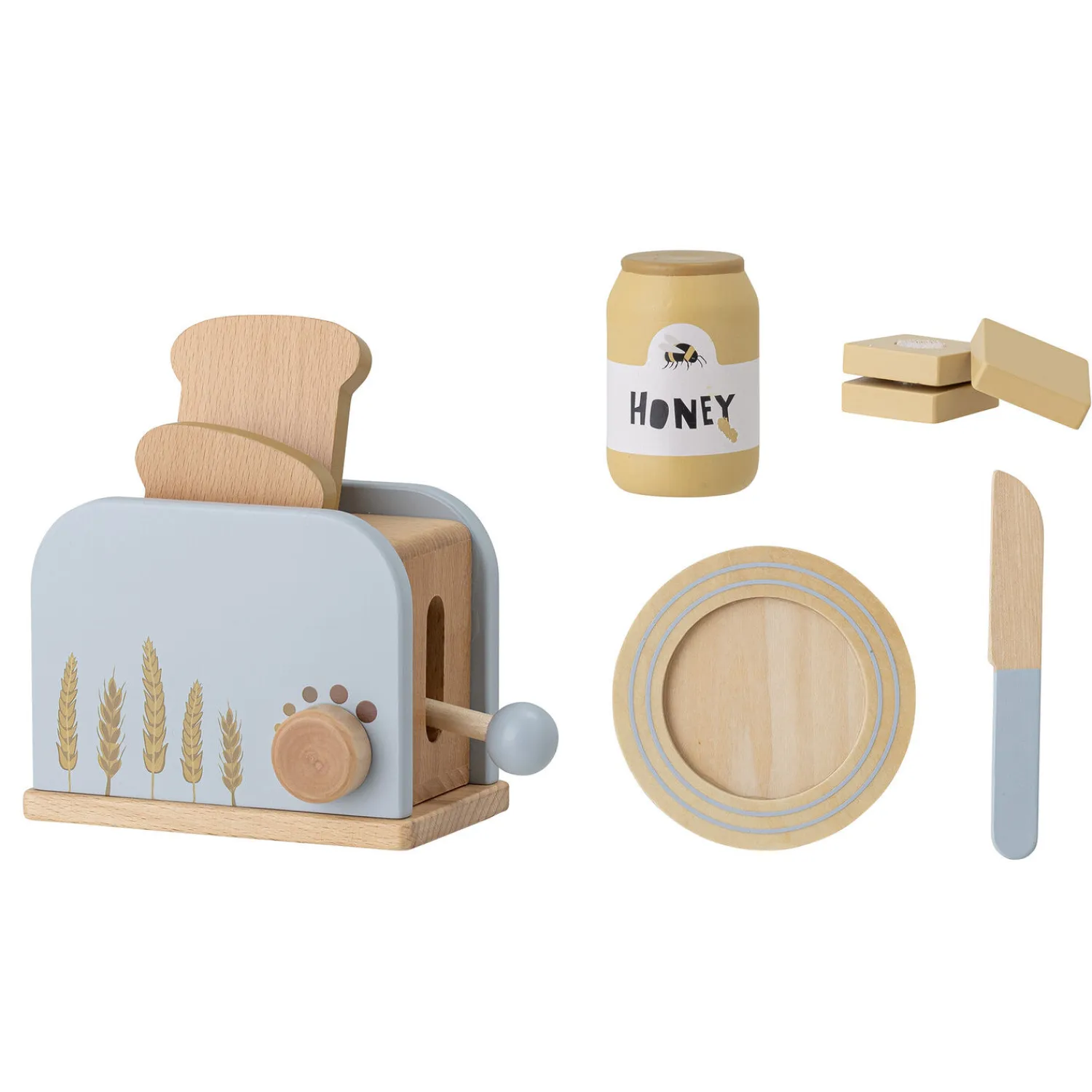 Adda Toy Food fra Bloomingville MINI er et sæt med 7 genstande lavet af bøgetræ og malet i bløde blå farver. Sættet indeholder en brødrister, brød, honning, smør (kan deles), tallerken og kniv. Alt hvad du behøver til et morgenbord. Bland legetøjsmaden sammen med alle vores eksisterende produkter. Legetøjsmaden kommer i en flot gaveæske.