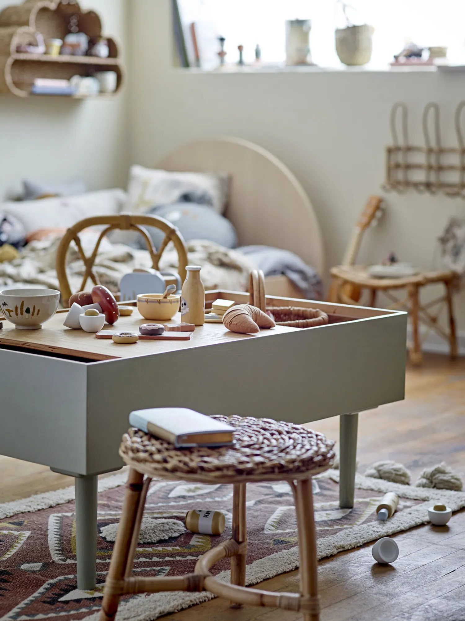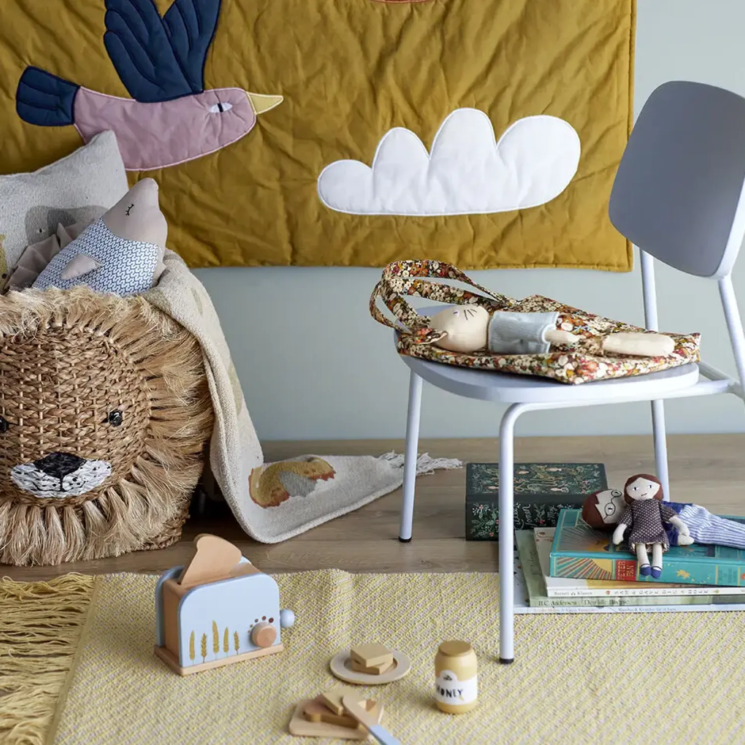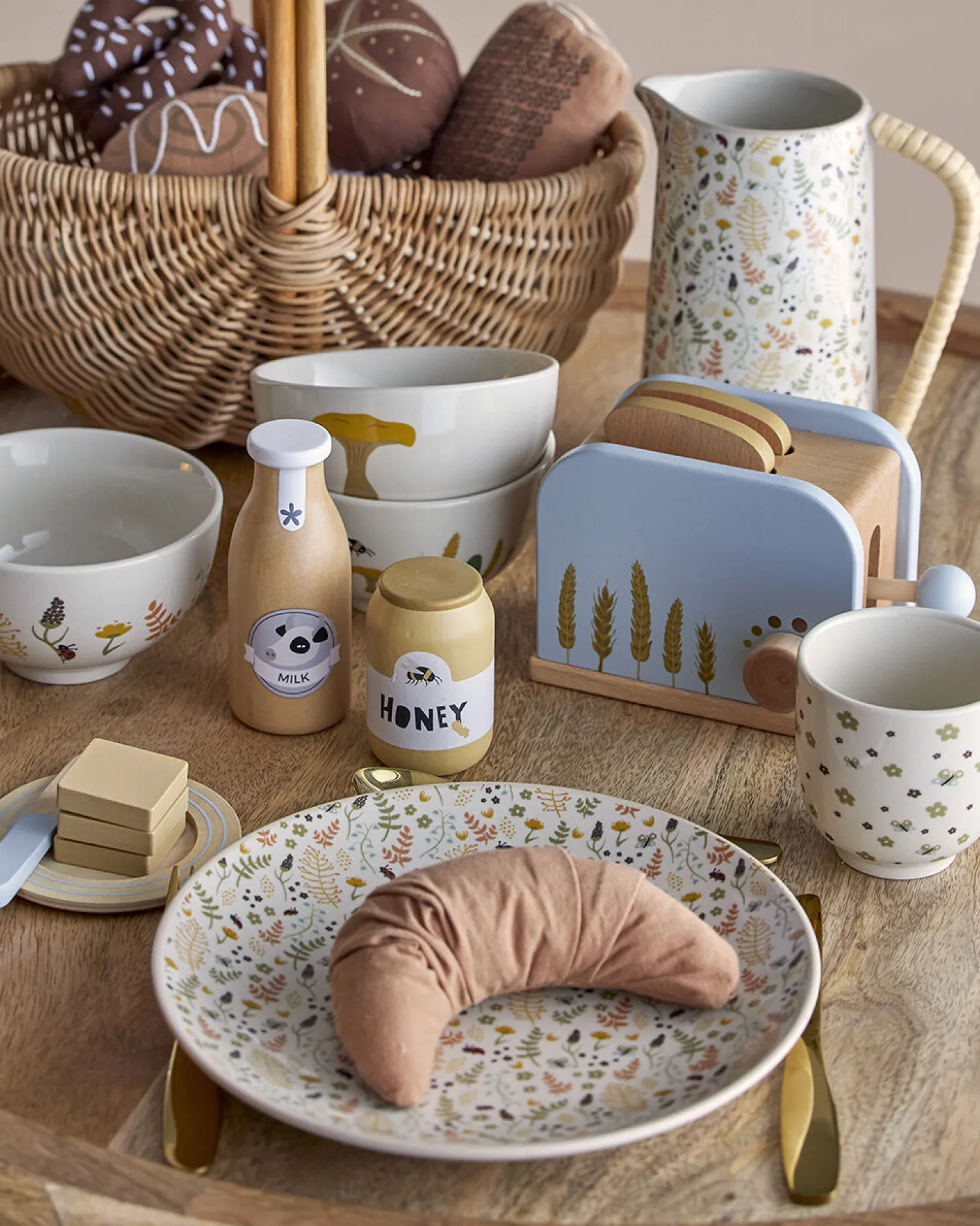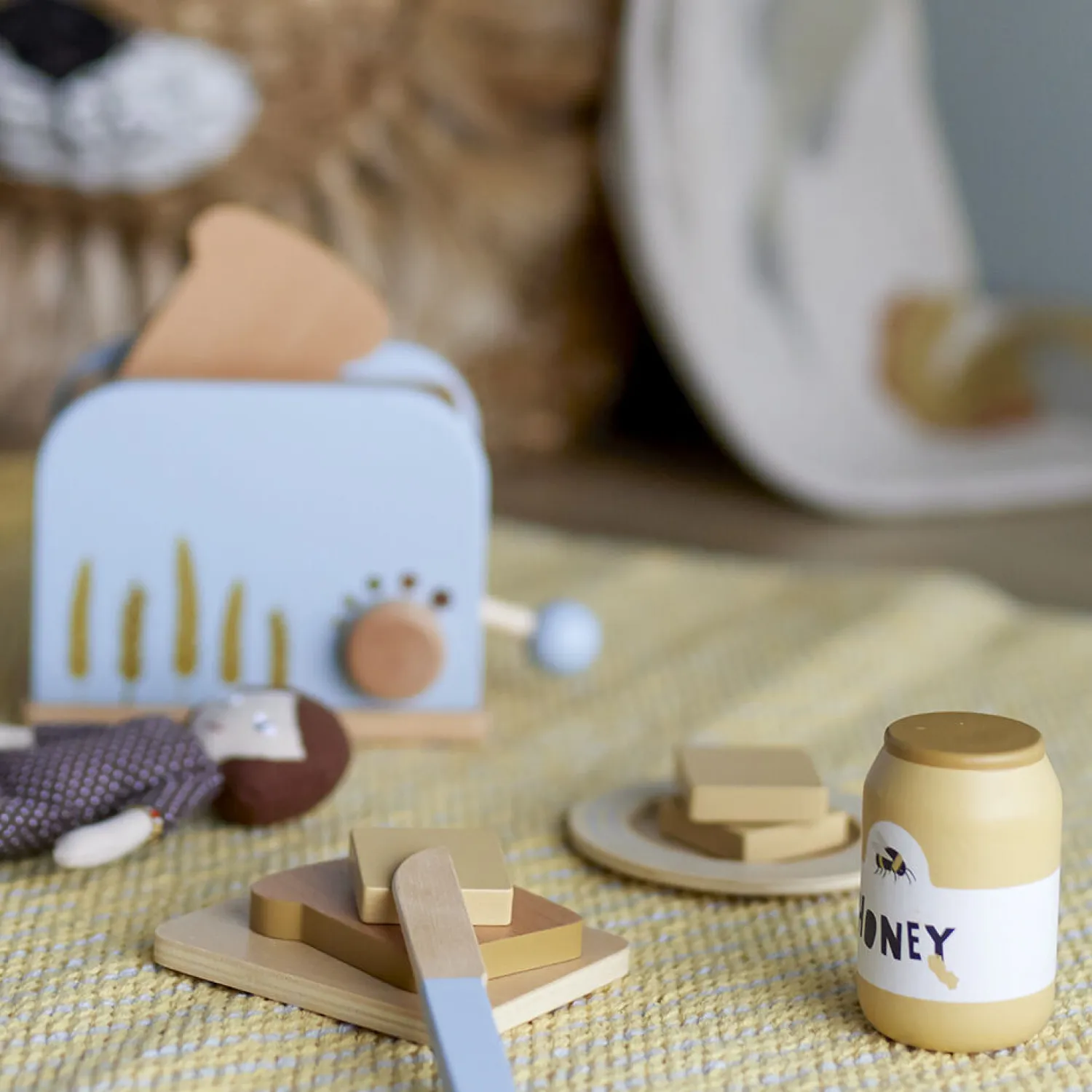 Adda Toy Food fra Bloomingville MINI er et sæt med 7 genstande lavet af bøgetræ og malet i bløde blå farver. Sættet indeholder en brødrister, brød, honning, smør (kan deles), tallerken og kniv. Alt hvad du behøver til et morgenbord. Bland legetøjsmaden sammen med alle vores eksisterende produkter. Legetøjsmaden kommer i en flot gaveæske.