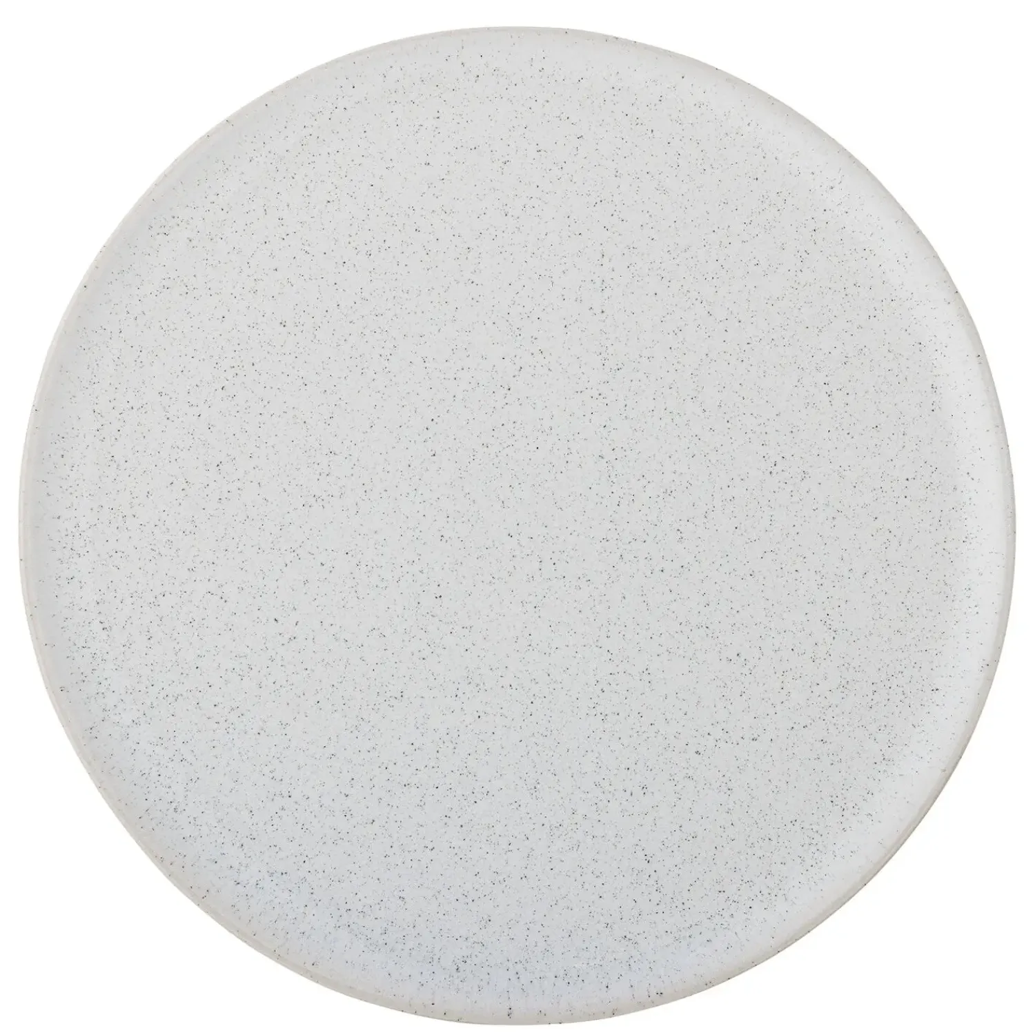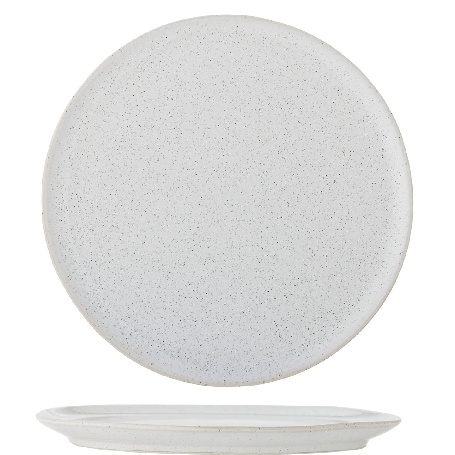 Tallerkenen er fremstillet i robust stentøj med en hvid, plettet glasur, der giver hver tallerken sit eget særpræg. Bemærk, at der kan forekomme naturlige variationer i glasuren, hvilket bidrager til det unikke udtryk.