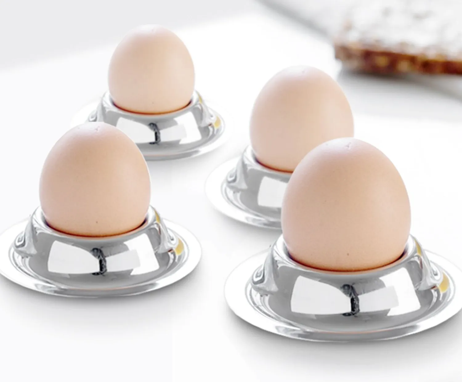 Dette sæt med fire æggebægre i rustfrit stål giver dig holdbare og vedligeholdelsesvenlige serveringsmuligheder til morgenbordet. Den blanke overflade er nem at holde ren og giver en flot præsentation af dine blødkogte æg.