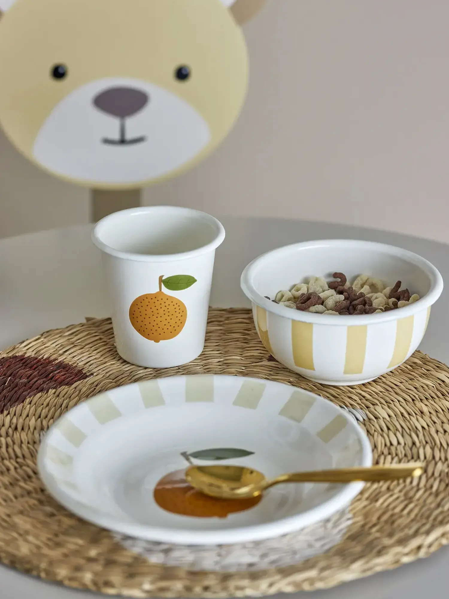 Dette fødevaregodkendte stelsæt fra Bloomingville består af tre dele: en kop, en skål og en tallerken. Sættet er fremstillet i jern med en karakteristisk orange farve og trykt dekoration, der skaber et sammenhængende udtryk.