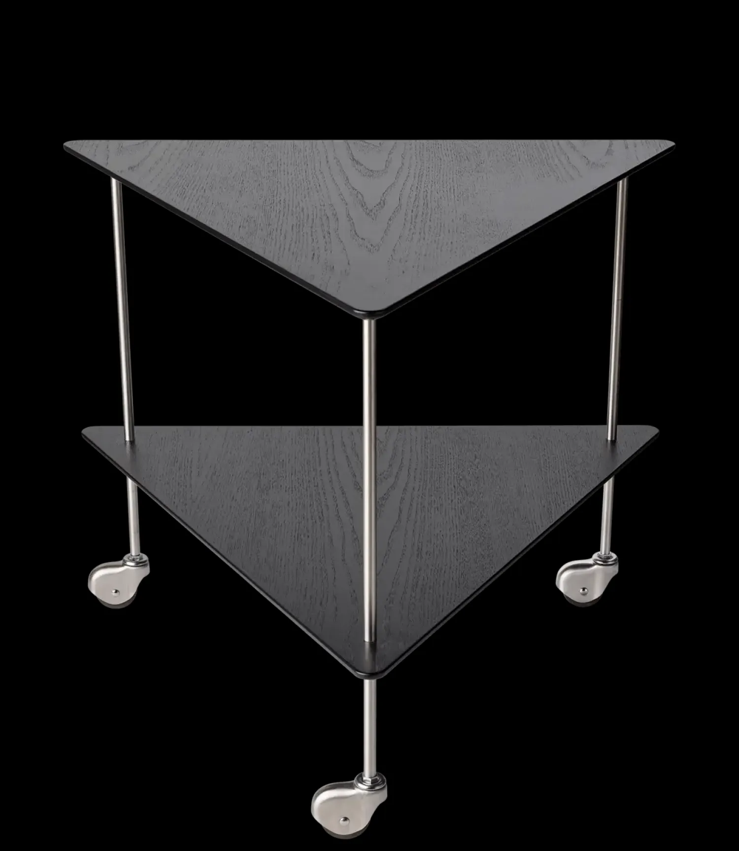 Dette rullebord kombinerer rustfrit stål med hairline-finish og MDF askefiner i en triangulær konstruktion. Med hjul på alle tre ben kan du nemt flytte det mellem rum, mens de to hylder giver praktisk opbevaringsplads til drikkevarer, servering eller kontorartikler.