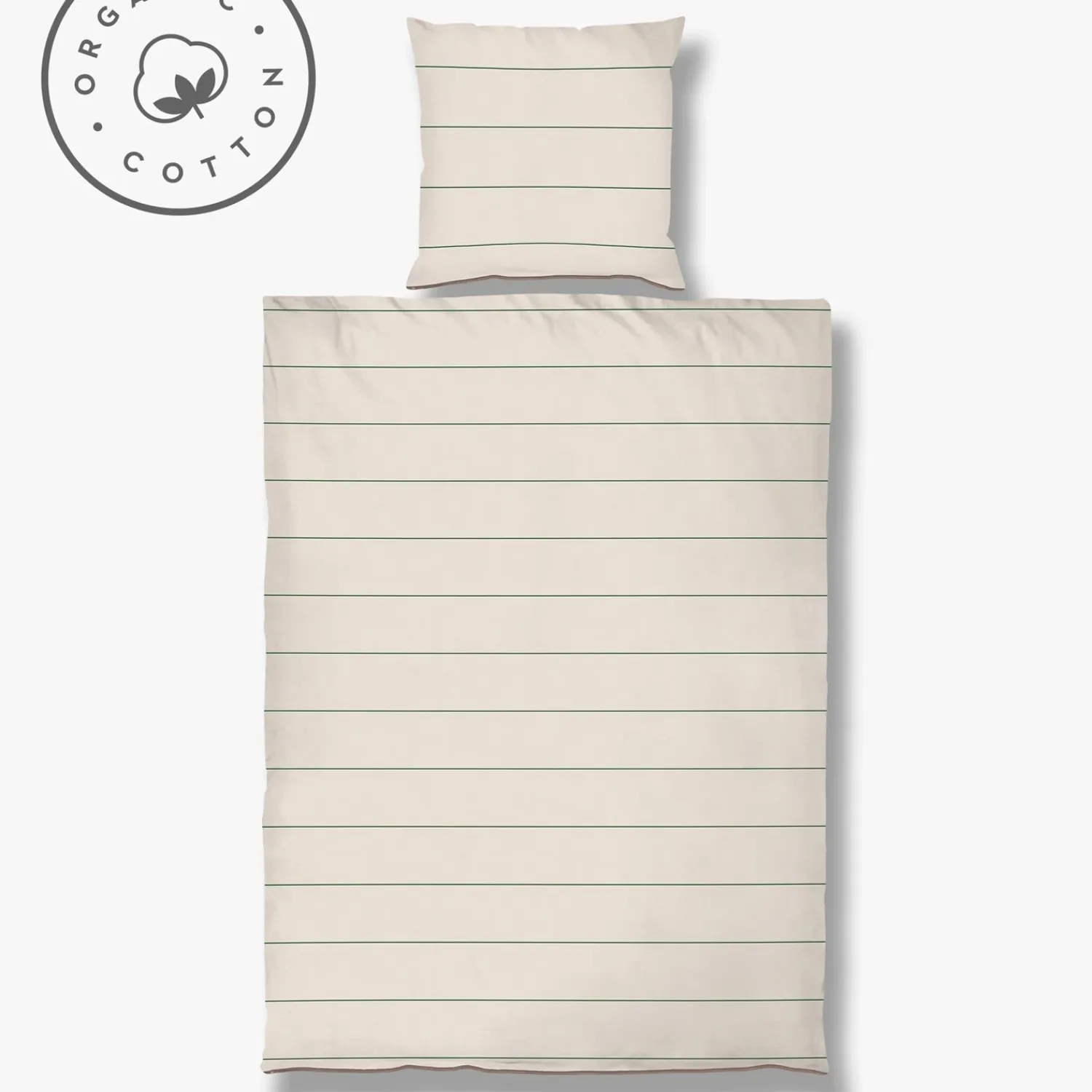 Sov ekstra godt og forvandl din søvn med det nye ALIGN-sengetøj fra Mette Ditmer. Sættet har en sandfarvet base med smalle, grønne striber, der tilfører et frisk og moderne touch til dit soveværelse. En smuk lattefarvet YKK-kvalitetslynlås giver et diskret, men elegant blikfang og viser den opmærksomhed på detaljer, som er kendetegnende for dette design.
